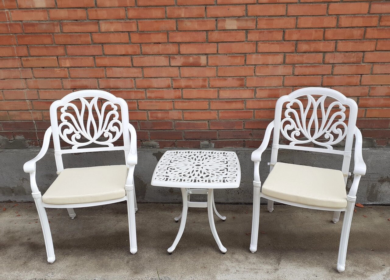 Белый комплект мебели Malta из литого алюминия на 2 персоны, благодаря своим размерам будет очень выгодно смотреться на балконе или лоджии. Это уличная мебель, которой не страшны перепады температур и различные погодные осадки. Данный набор включает в себя 2 кресла с бежевыми подушками и кофейный столик.