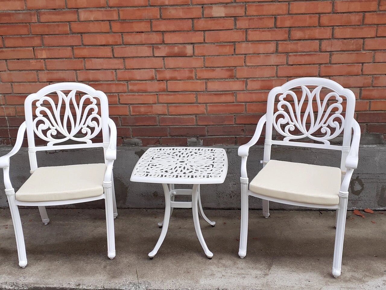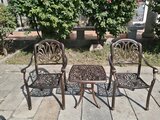 Небольшой, но очень красивый комплект мебели из литого алюминия на 2 персоны, благодаря своим размерам будет очень выгодно смотреться на балконе или лоджии. Это всепогодная мебель, которой не страшны перепады температур и различные погодные осадки. В комплект входит 2 кресла с подушками и кофейный столик.