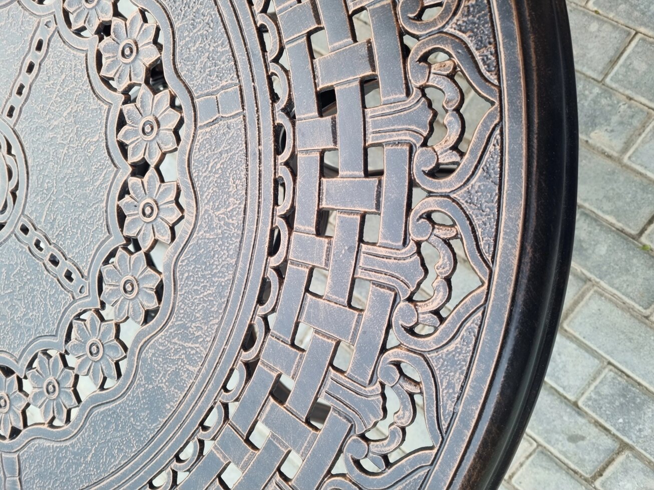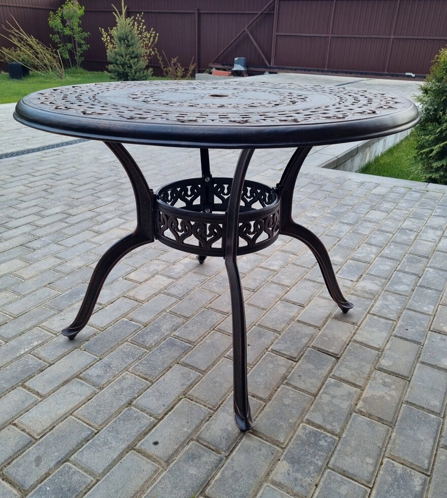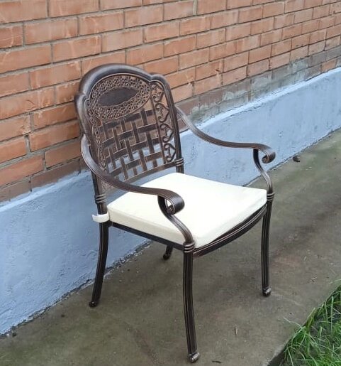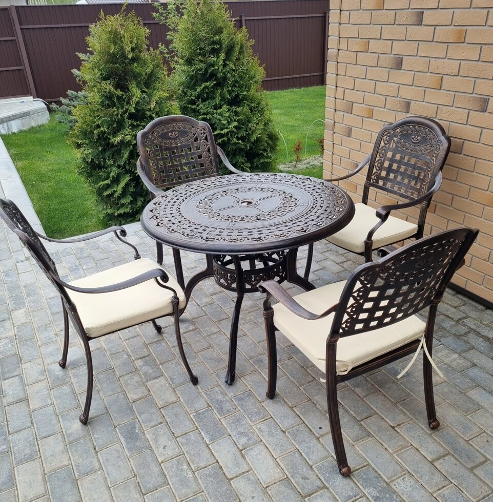 Небольшой комплект мебели из литого алюминия под ковку на 4 персоны будет отлично смотреться на вашей веранде или в беседке. Благодаря небольшому столу эта металлическая мебель не будет занимать много места, при необходимости кресла собираются одно в другое. В отличии от кованой мебели данный комплект легкий, не ржавеет, легко переносит погодные осадки и смену температур, да и выглядит современно. Набор состоит из круглого стола и 4 кресел с подушками.