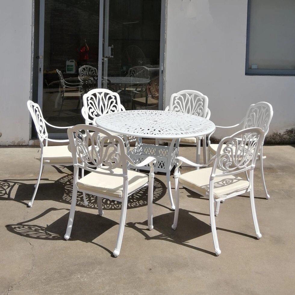 Невероятно красивая белая садовая мебель из литого алюминия с круглым столом на 6 персон будет отлично смотреться в Вашем загородном доме. Большой и вместительный стол будет занимать не много места. Набор состоит из круглого стола и 6 кресел с бежевыми подушками.
