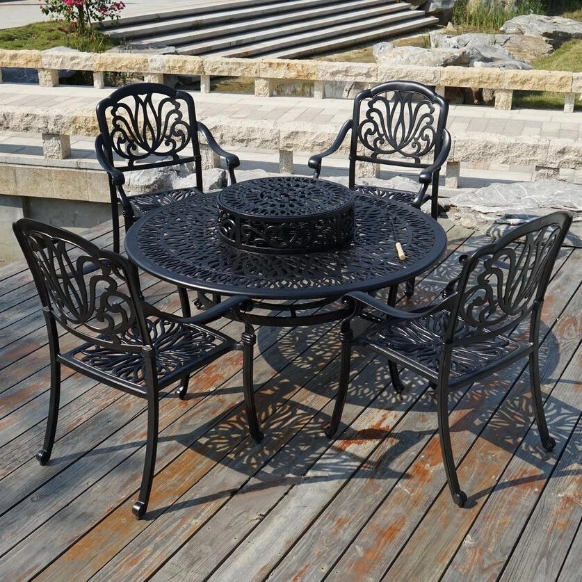 Особенностью садовой мебели из литого алюминия Etna является стол с барбекю. Вы самостоятельно можете готовить овощи, рыбу, мясо вместе со своими друзьями, в комплектации стола есть все для этого необходимое (как на фото). Комплект алюминиевой мебели состоит из стола-барбекю и 4 кресел с подушками. Диаметр металлического стола позволяет комфортно разместиться компании из 6 человек.