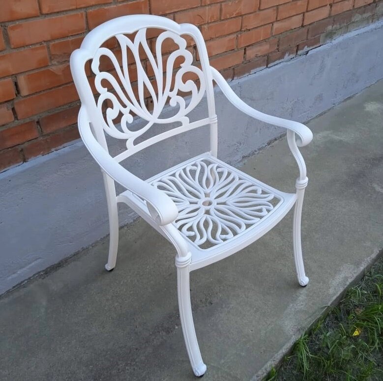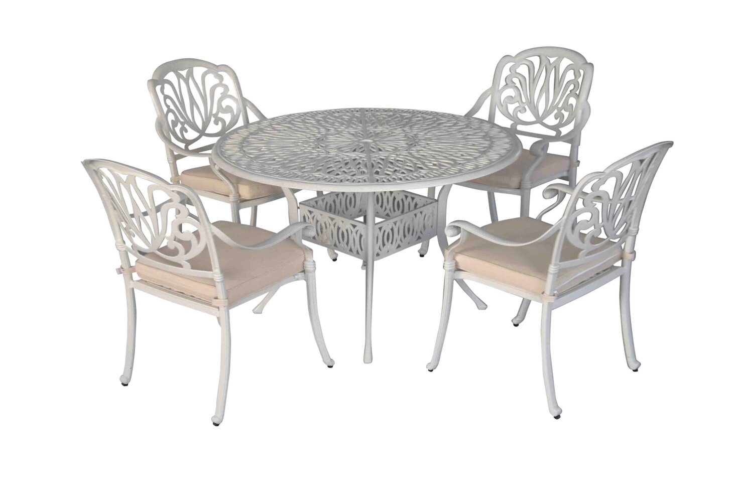 Металлический обеденный комплект мебели William IV из литого алюминия белого цвета рассчитан на 4-6 персон и роскошно смотрится в любом уголке сада, дома или на террасе. Литая мебель из легкого алюминия с большим круглым столом диаметром 122 см и шикарными алюминиевыми креслами создает эффект кованой мебели, но намного легче и не ржавеет, хорошо переносит капризы погоды. Комплект состоит из круглого стола и 4 кресел со светло-бежевыми подушками.