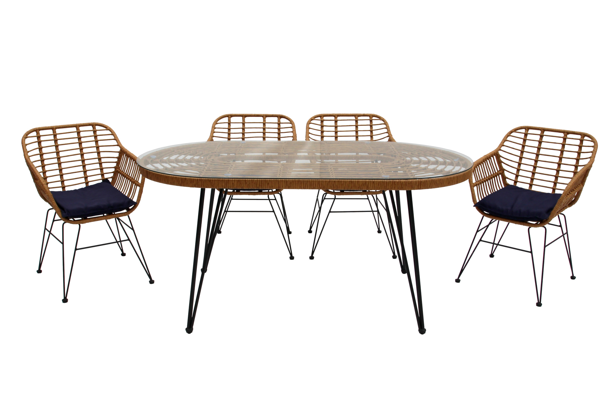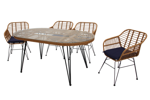 Габариты элементов (Ш/ГхДхВ) : Стол (Ш/Д/В): 90х160х76 Стул: 59х57х80 Цвет каркаса : черный Материал каркаса : сталь Толщина мягкого элемента : 4 Цвет поверхности : бежевый Материал поверхности : искусственный ротанг, сталь Комплектация : стол, 4 кресла Использование на открытом воздухе : да Страна производства : КИТАЙХарактеристики