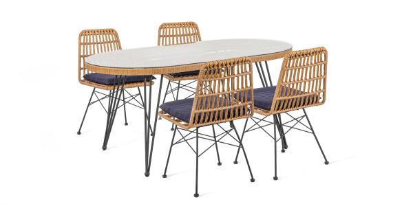 Габариты элементов (Ш/ГхДхВ) : Стол: 160х90х75 4 кресла: 47х58х84 Цвет каркаса : черный Материал каркаса : сталь Цвет чехла мягкого элемента/матраса : синий Узор ткани : без рисунка Материал чехла мягкого элемента : полиэстр Цвет поверхности : бежевый Материал поверхности : искусственный ротанг, сталь Комплектация : стол, 4 кресла Использование на открытом воздухе : да Страна производства : КИТАЙ Дополнительно : в одном коробе 2 стулаХарактеристики