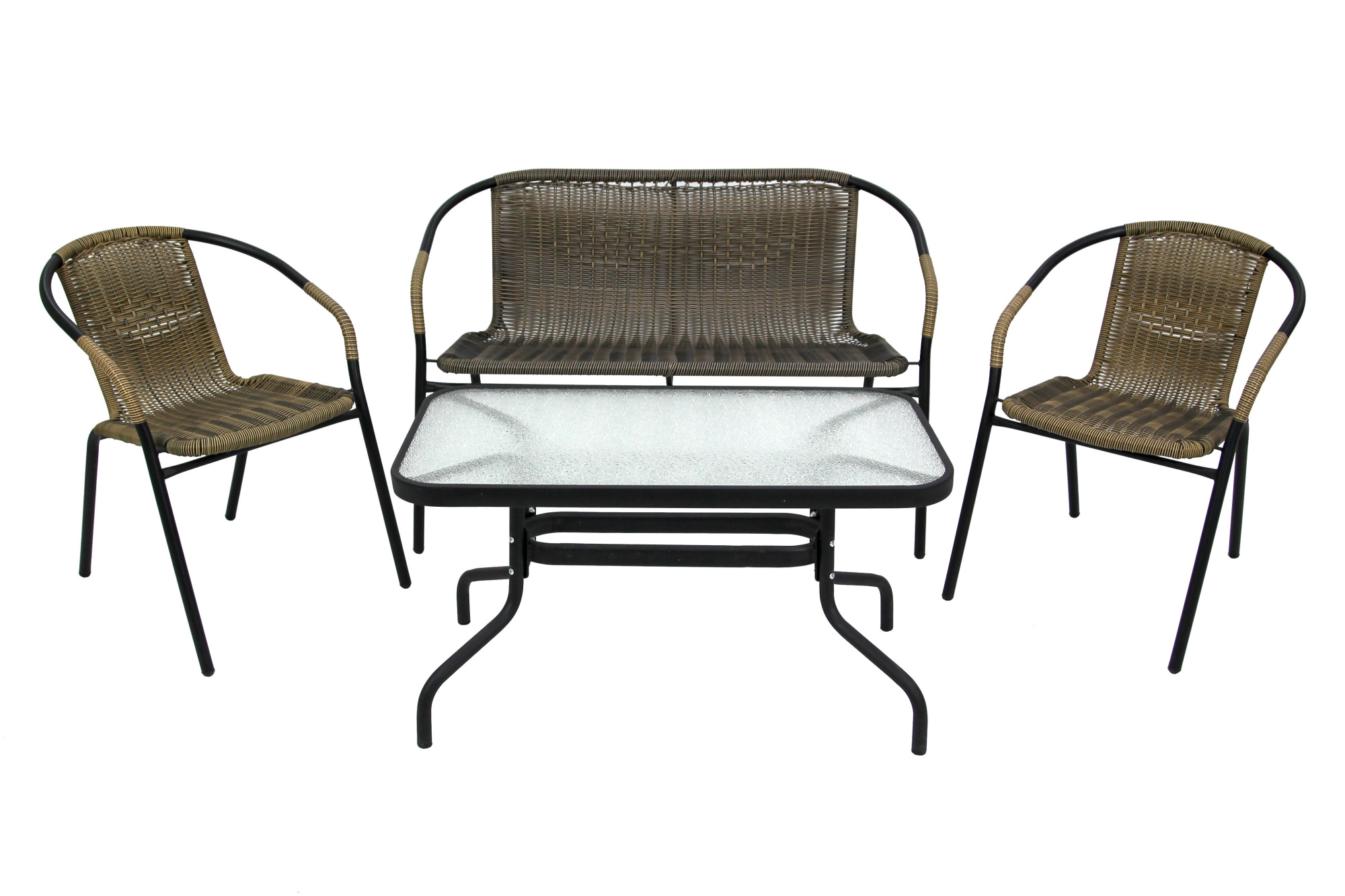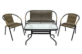 Габариты элементов (Ш/ГхДхВ) : стол: 90х50х50 стул: 56х54х73 диван:113х58х78 Цвет каркаса : черный Материал каркаса : сталь Цвет поверхности : желто-черный Материал поверхности : искусственный ротанг, стекло Комплектация : стол, 2 кресла, диван Страна производства : КИТАЙХарактеристики