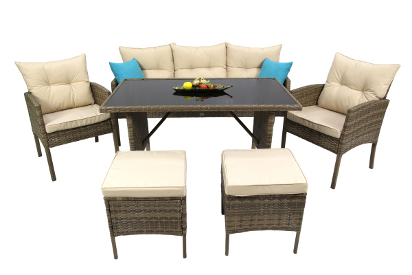 Габариты элементов (Ш/ГхДхВ) : Трехместный диван:161x67x78 Кресло:60x67x78 Обеденный стол:120x64x70 стул:38x38x40 Дополнительные декоративные подушки: 2шт. Цвет каркаса : коричневый Материал каркаса : сталь Цвет чехла мягкого элемента/матраса : бежевый Узор ткани : без рисунка Материал чехла мягкого элемента : водоотталкивающая ткань Толщина мягкого элемента : 50 Цвет поверхности : коричневый Материал поверхности : искусственный ротанг, стекло Комплектация : стол+диван+2 стула+2 кресла ротанг кор., подушки бежевые+декоративные подушки 2шт Использование на открытом воздухе : да Страна производства : КИТАЙ Дополнительно : диван,кресло,стул,стол+декоративные подушки 2 шт.: размер 40х40 смХарактеристики