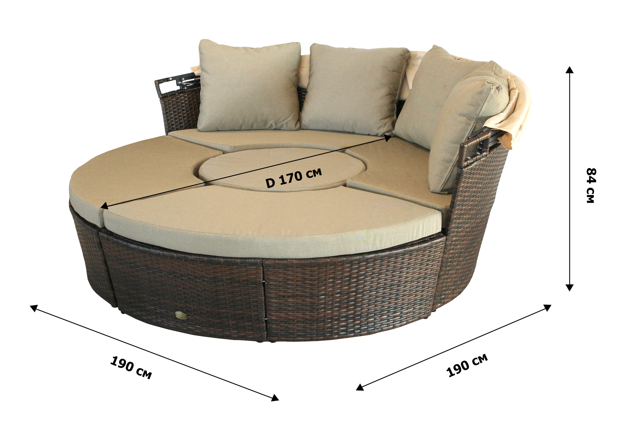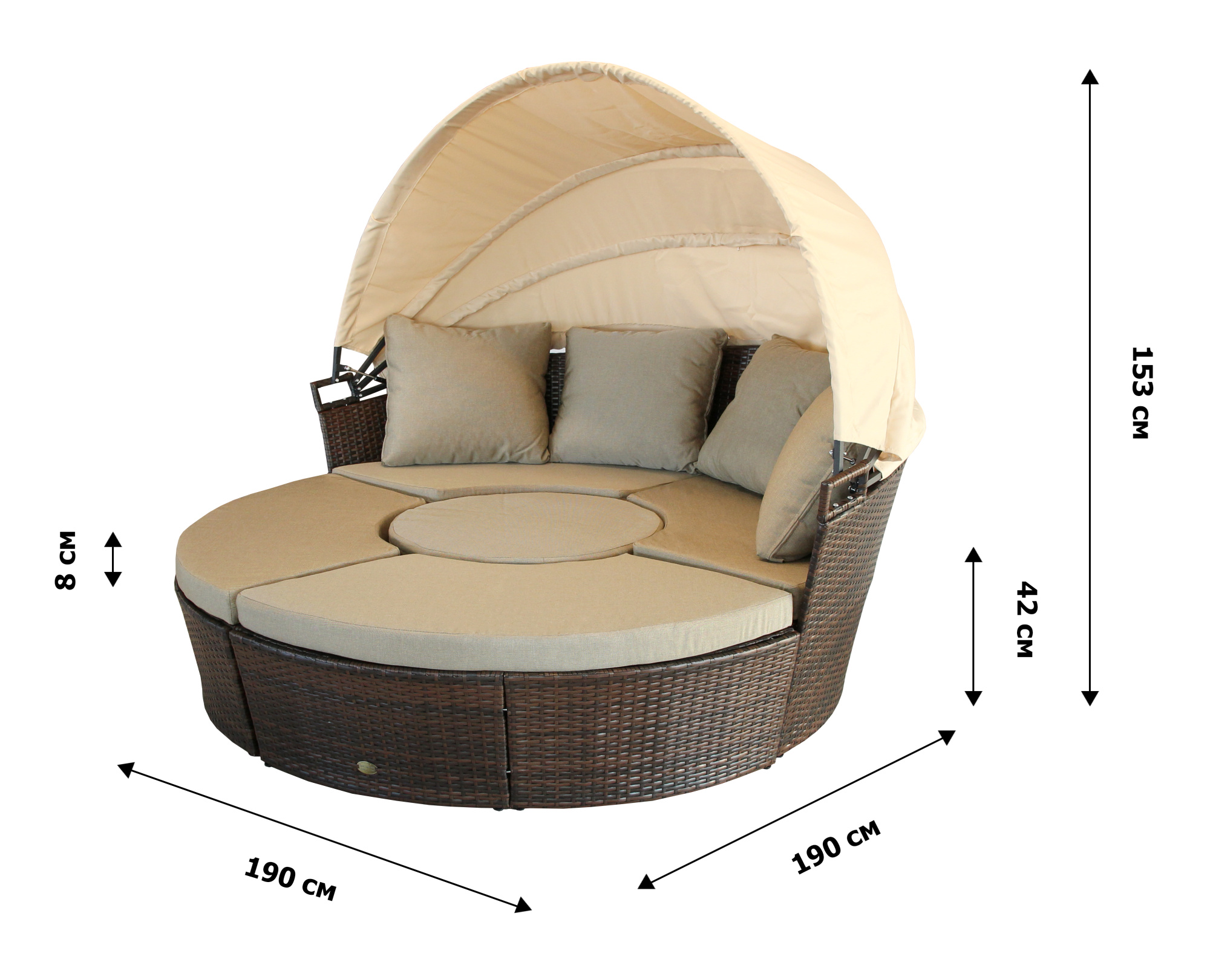 Габариты элементов (Ш/ГхДхВ) : в собраном виде: 187*187*H160 подушки: 43*43 Набор по элементам: центральный диван:180х55хH77 боковые диваны: 90х55хH30 столик: D65хH30 Цвет каркаса : коричневый Материал каркаса : сталь Цвет чехла мягкого элемента/матраса : бежевый Узор ткани : без рисунка Материал чехла мягкого элемента : полиэстер+хлопок Толщина мягкого элемента : 50 Цвет поверхности : коричневый Материал поверхности : искусственный ротанг, сталь Комплектация : стол, 3 дивана, крыша Страна производства : КИТАЙ Дополнительно : модель раздвигается на 4 части, центральный диван, два боковых дивана, и круглый столХарактеристики
