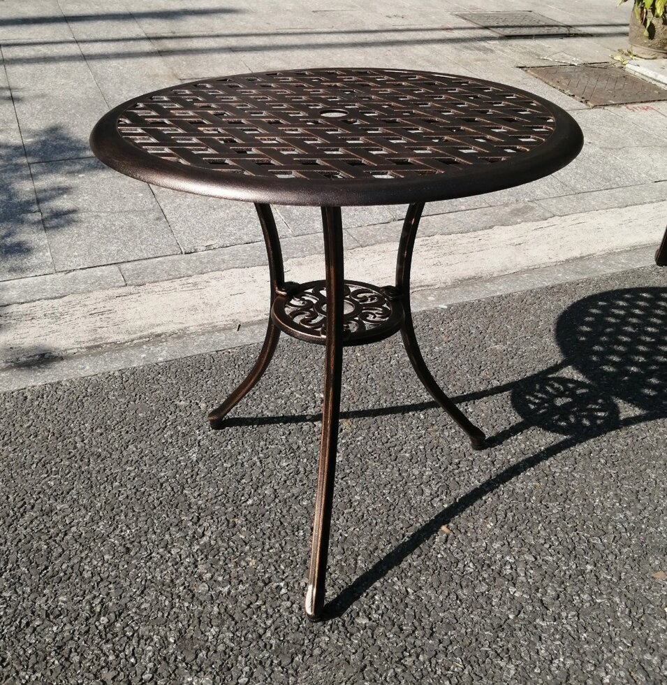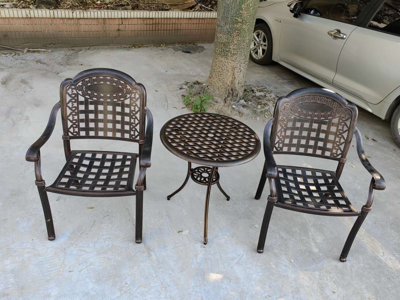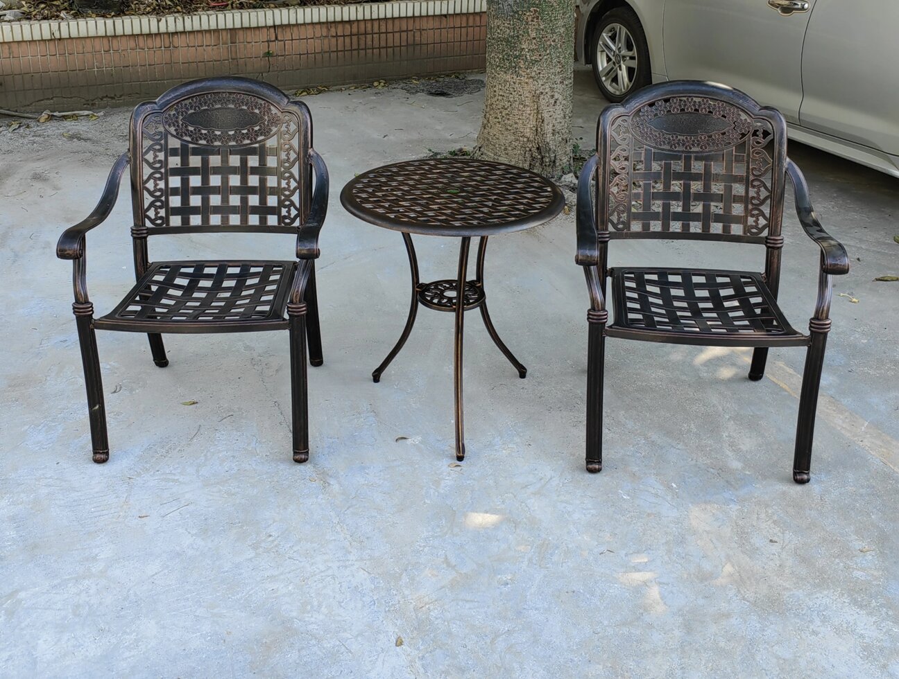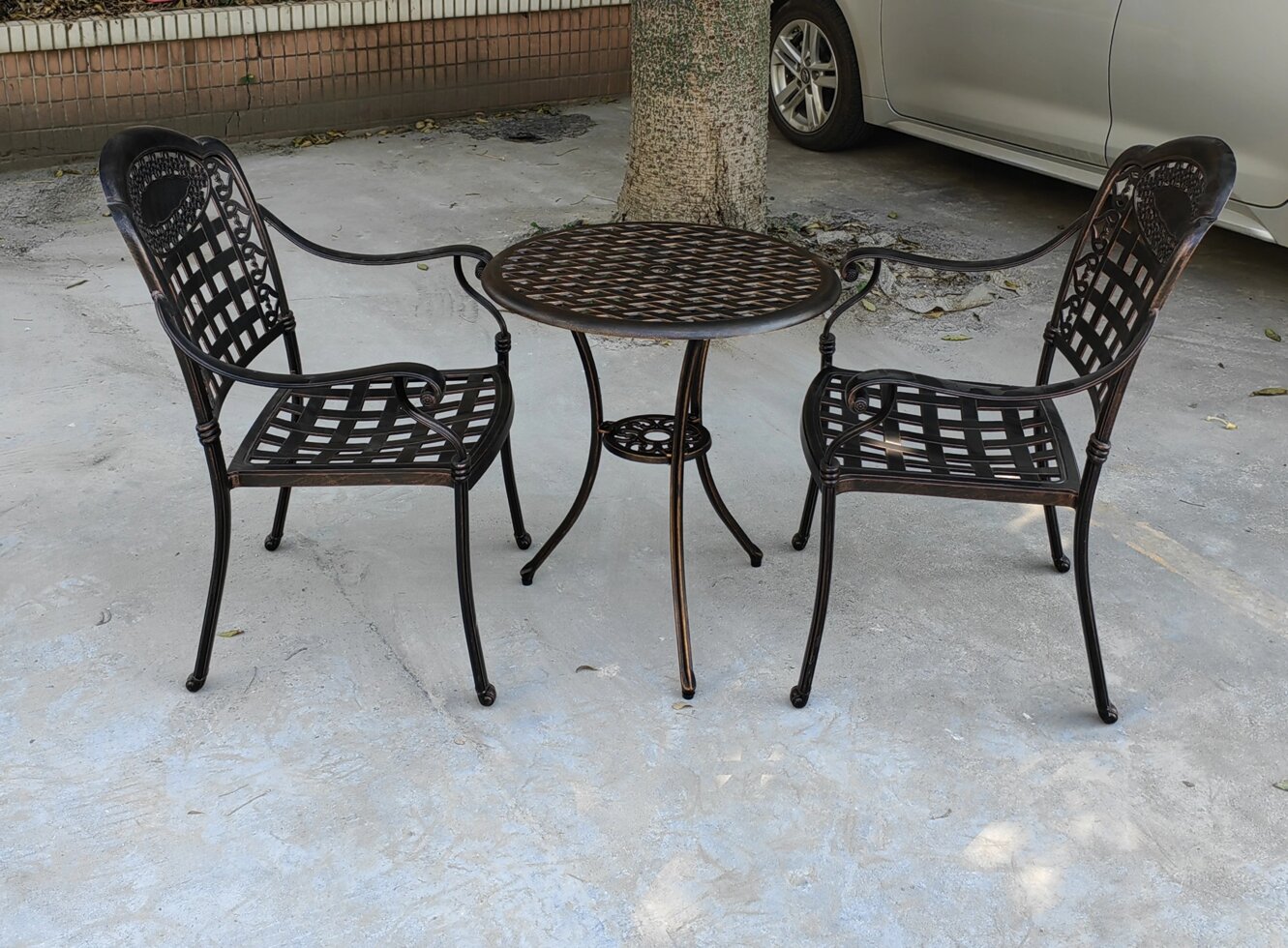 Комплект садовой металлической мебели Harbin из литого алюминия прекрасно впишется в любой интерьер дома или сада. Набор состоит из круглого стола диаметром 60 см и двух кресел с бежевыми подушками. Цвет: античная бронза.