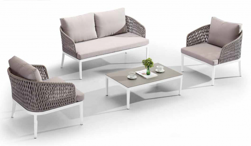 Комплект плетеной мебели Scarlet для отдыха рассчитан на 4 персоны. В комплект входит два кресла, двухместный диван и журнальный стол. Такой комплект прекрасно подойдет для обстановки террассы или сада как частных домов, так и различных заведений, отелей и спа-комплексов. Алюминиевый каркас мебели обеспечивает её небольшой вес, устойчивость, способность выдерживать большие нагрузки. Плетение выполнено из светло-серых ремней 10 мм. Состав комплекта: Кресло, размер: 870х860х720 мм - 2 шт. Двухместный диван, размер: 1600х860х720 мм - 1 шт. Журнальный стол, размер: 1000х600х320 мм - 1 шт. Характеристики: Алюминиевый каркас. Порошковое покрытие ножек светло-серого цвета. Плетение из светло-серых ремней 10 мм. Подушки толщиной 80 мм входят в комплект. Столешница 7 мм из закаленного стекла (цвет 025C). Обратите внимание! Фабрика Tagliamento оставляет за собой право вносить изменения в собственные изделия в любой момент, которые сочтет необходимыми в целях улучшения своих изделий на основании нововведений и требований рынка.Характеристики