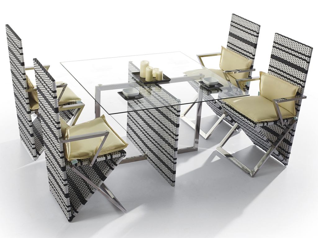 В комплект входит: 1. Кресло, размер 560х480х1080 мм - 4 шт. 2. Стол, размер 1200х1200х760 мм - 1 шт. Мебель выполнена на алюминиевой раме. Основание стола и стульев (неоплетенные части) из нержавеющей стали. Плетение из искусственного ротанга выполнено вручную. Цвет ротанга: бело-черный. Тип плетения: плоское. Подушки на сиденья из ткани бежевого цвета включены в стоимость. Толщина подушек 40 мм. Оснащены молнией. Столешница выполнена из закаленного стекла толщиной 7 мм. Обратите внимание! Фабрика Tagliamento оставляет за собой право вносить изменения в собственные изделия в любой момент, которые сочтет необходимыми в целях улучшения своих изделий на основании нововведений и требований рынка.Характеристики