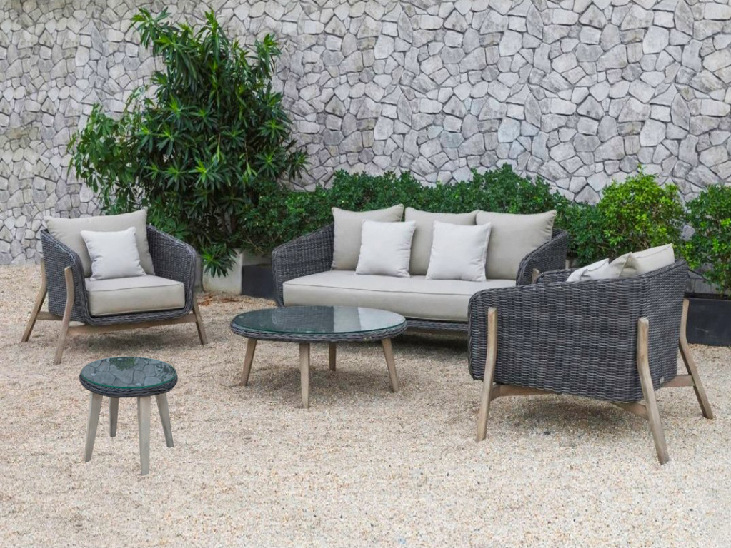 Jura представляет собой комплект лаунж мебели из искусственного ротанга, состоящий из 3-местного дивана, двух кресел, кофейного и бокового столиков, которые обеспечивают удобство и комфорт во время сидения. Благодаря своей универсальности и красоте мебель коллекции Jura успешно справляется с задачей, когда дело доходит до украшения дома, сада, террас или общественных пространств. Изготовленная из искусственного ротанга в сочетании с рамой из массива акации, полученного экологически безопасным способом, мебель идеально подходит для придания нотки тренда и индивидуальности любому пространству, как в помещении, так и на открытом воздухе. Применение специально разработанных высококачественных материалов позволяет использовать комплект Jura на открытом воздухе в полной безопасности, обеспечивая максимальную защиту от атмосферных воздействий без ущерба для эстетики и комфорта. Состав комплекта: Трехместный диван, размер 1950х850х750 мм - 1 шт. Кресло, размер 1000х850х750 мм - 2 шт. Кофейный столик, размер Ø900х350 мм - 1 шт. Боковой столик, размер Ø450х450 мм - 1 шт. Особенности: Каркас мебели выполнен из массива акации, которая превосходно переносит перепады температур, является влагостойкой, хорошо сопротивляется насекомым-вредителям, гнили, плесени, не трескается и не коробится. Отделка: WC6. Структура рамы кресел и дивана: алюминий с порошковым покрытием толщиной 1.2 мм. Плетение выполнено из полукруглого искусственного ротанга. Состав - полиэтилен высокой плотности HDPE со стойкостью к ультрафиолетовому излучению 2000 часов. Материал характеризуется превосходными прочностью и долговечностью по сравнению с традиционными природными волокнами и, кроме того, практически не требует обслуживания и легко чистится. Отделка: COB6C. Мебель комплектуется мягкими подушками толщиной 150 мм с обивкой из полиэстера с кантом. Плотность ткани 250 г/м2. Водоотталкивающая пропитка. Наполнение подушек из быстросохнущего поролона QuickDry, устойчивого к влажности, микробам и плесени благодаря постоянной циркуляции воздуха. Цвет подушек: OF-428. Плетеные столешницы столиков сверху имеют закаленное стекло толщиной 8 мм. Столики поставляются в разобранном виде. Объем упаковки: диван - 1.24 м3, кресла - 2х 0.64 м3, кофейный столик - 0.12 м3, боковой столик - 0.03 м3. Открыть инструкцию по уходу. Вся деревянная мебель должна обрабатываться специальным маслом или пропиткой минимум 1 раз в 6 месяцев (в условиях высокой влажности обработку следует проводить чаще). Для данной мебели не рекомендуются резкие температурные перепады. Мебель из дерева акации должна использоваться только под навесом. Дерево является натуральным материалом, поэтому любые трещины, неравномерные природные рисунки, различность оттенков ‐ являются естественным процессом, который вызван температурными изменениями или влажностью.Характеристики