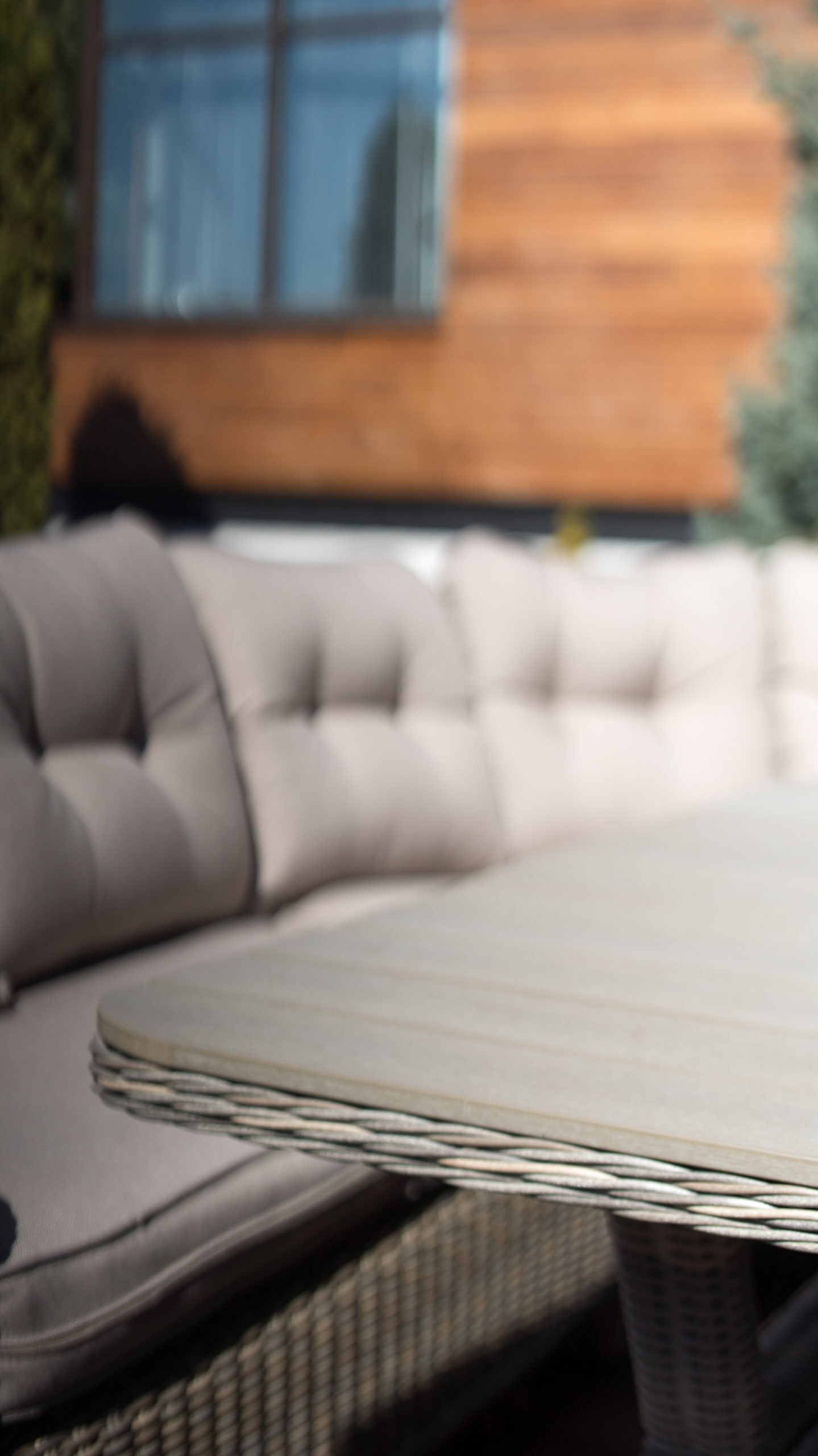 Угловой комплект из искусственного ротанга СОРРЕНТО обеденная группа Набор мебели из искусственного ротанга Сорренто — это воплощение стиля, легкости и изящества, при этом отличительной особенностью комплекта являются устойчивость к влаге, солнечным лучам и перепадам температур! Каркас кресел, дивана и пуфика изготовлены из алюминия, легкий, прочный металл, совершенно не боится коррозии. Благодаря каркасу, изготовленному из алюминия, комплект мебели выдерживает большой вес. Покрытие кресел — искусственное пластиковое плетение имитирующее ротанг. Оно отличается высокой прочностью, износостойкостью и долговечностью. Такое покрытие с легкостью выдерживает любые погодные условия. Бренд BESTAFIESTA предлагает удобную красивую мебель, используя только качественные материалы и модные тренды. Материал: Искусственный ротанг Вид мебели: Комплекты садовой мебели Материал: Polywood. Комплектация: обеденный стол, угловой диван с подушками на семь человек, два кресла с подушками и два пуфика Размер: пуфик 45*45 см, высота 52 см, толщина подушек 12 см Размеры: диван левый 128*56*90см, диван правый 128*56*90см, диван угол - 124см, высота 90см, глубина сиден - 56см. Размеры: кресло ш-58см, г- 50см, в- 90см Размеры: стол 145*145*70 см Материал: поливуд (искусственное дерево) искусственный ротанг/алюминиевый каркас Цвет подушек: серый, молний на подушках нетХарактеристики