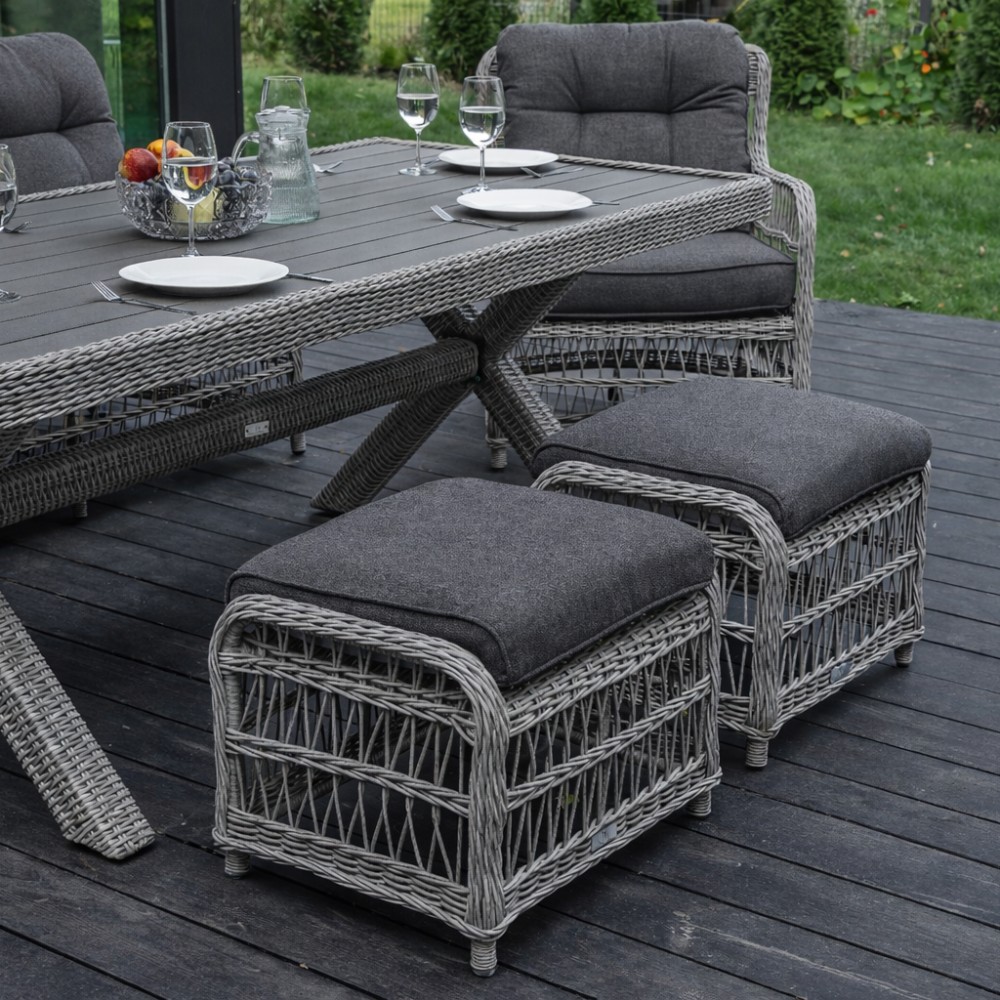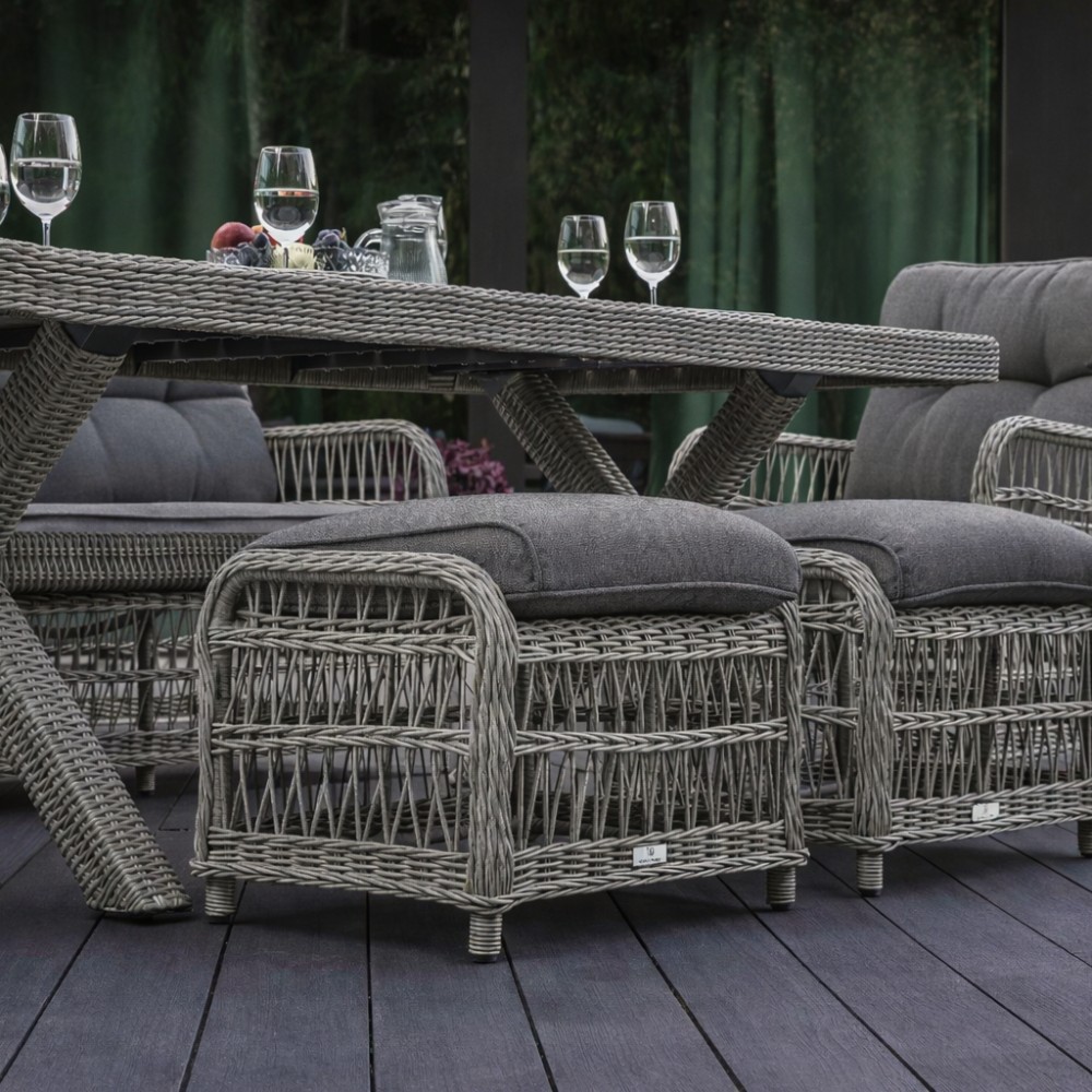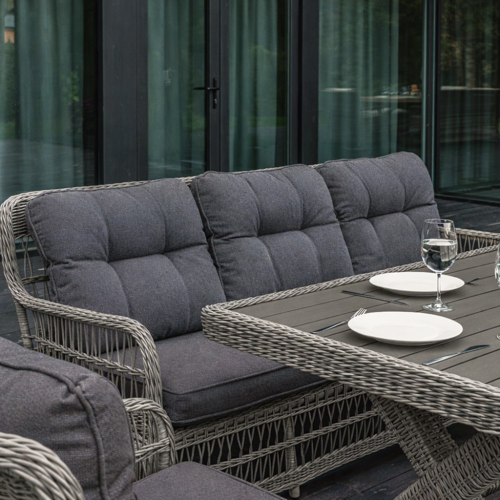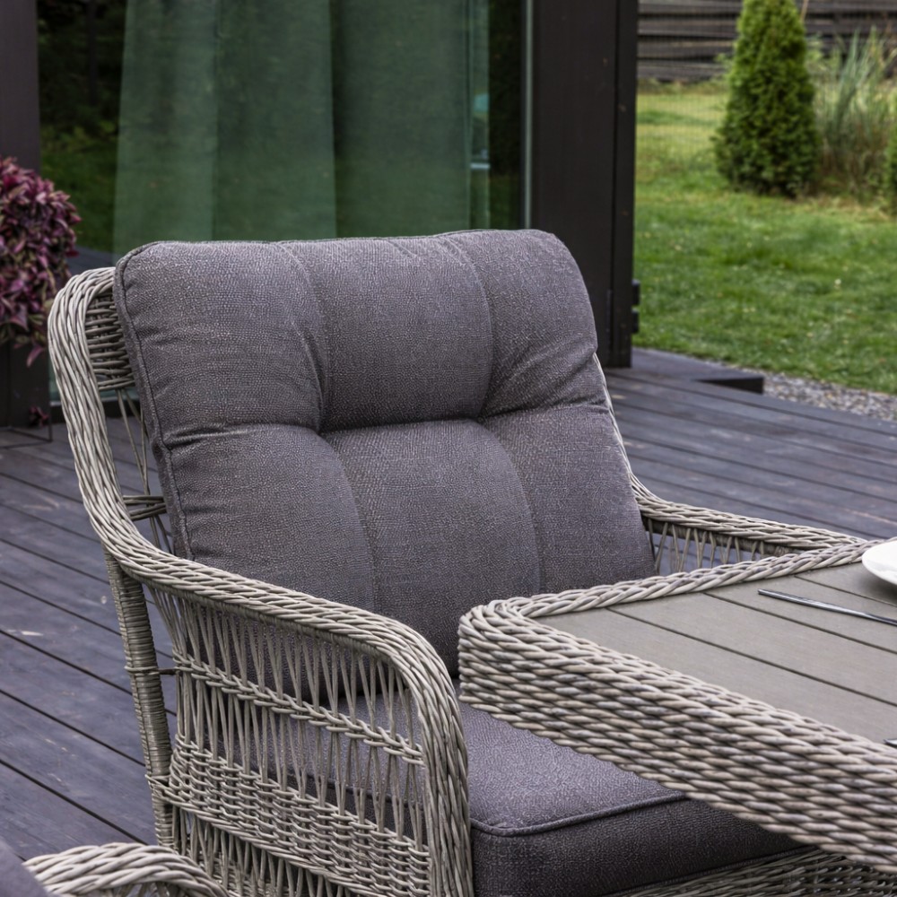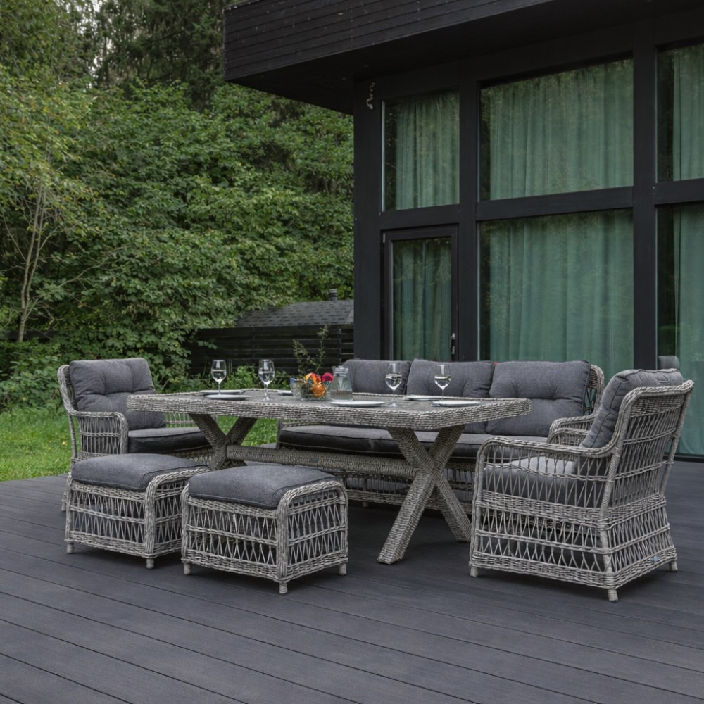 Комплектация и габариты: Трехместный диван - 196х78х85 см Кресла (2 шт) - 73x78x92 см Обеденный стол - 200х100х74 см Пуф (2 шт) - 57х45х50 см Подушка для спины (2 шт) - 60х63х10 см Подушка для сидения (2 шт) - 60х53х18 см Подушка дивана для сидения (1 шт) - 184х63х10 см Подушка дивана для спины (3 шт) - 60х53х18 см Подушка для пуфа (2 шт) - 50х48х10 см Материалы: Материал комплекта - искусственный ротанг (ручного плетения) Материал каркаса – алюминий, окрашенный порошковым методом Материал столешницы - поливуд Материал чехла на подушки - олефин (водоотталкивающая ткань) Материал наполнителя подушек для сидения - поролон Цвет комплекта - Серый Цвет подушек - Темно-серый Дополнительная информация: Количество посадочных мест – 7 человек Максимальная нагрузка на посадочное место - 150 кг Чехлы съемные – на подушках для сидения Температурный режим - от -50॰C до +50॰C Накладки на ножки - да (пластиковые) Категория ротанга - первичная Держатели и крепления подушек зависят от поставки и не являются неотъемлемой частью комплекта Гарантия и эксплуатация: Гарантийный срок - 1 год Эксплуатационный срок - 10 лет Страна производитель - КитайХарактеристики