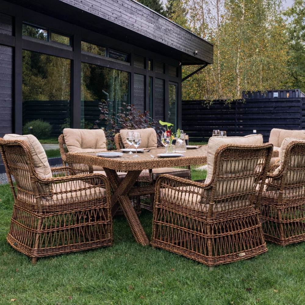Комплектация и габариты: Кресла ( 6 шт) - 63x78x92 см Обеденный стол - 200х100х74 см Подушки для сиденья (6 шт) 61х60х10 см Подушки для спины (6 шт) 56х60х10 см Материалы: Материал комплекта - искусственный ротанг (ручного плетения) Материал каркаса – алюминий, окрашенный порошковым методом Материал столешницы - поливуд Материал чехла на подушки - олефин (водоотталкивающая ткань) Материал наполнителя подушек для сидения - поролон Цвет комплекта - коричневый Цвет подушек - бежевый Дополнительная информация: Количество посадочных мест – 6 человек Максимальная нагрузка на посадочное место - 150 кг Чехлы съемные – на подушках для сидения Температурный режим - от -50?C до +50?C Сочетается с комплектами бренда ROYAL FAMILY - ALBERT Накладки на ножки - да (пластиковые) Категория ротанга - первичная Держатели и крепления подушек зависят от поставки и не являются неотъемлемой частью комплекта Гарантия и эксплуатация: Гарантийный срок - 1 год Эксплуатационный срок - 10 лет Страна производитель - КитайХарактеристики