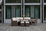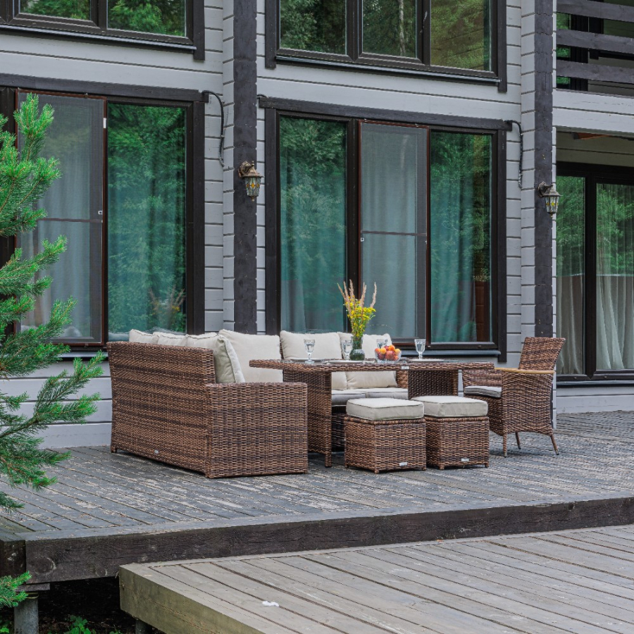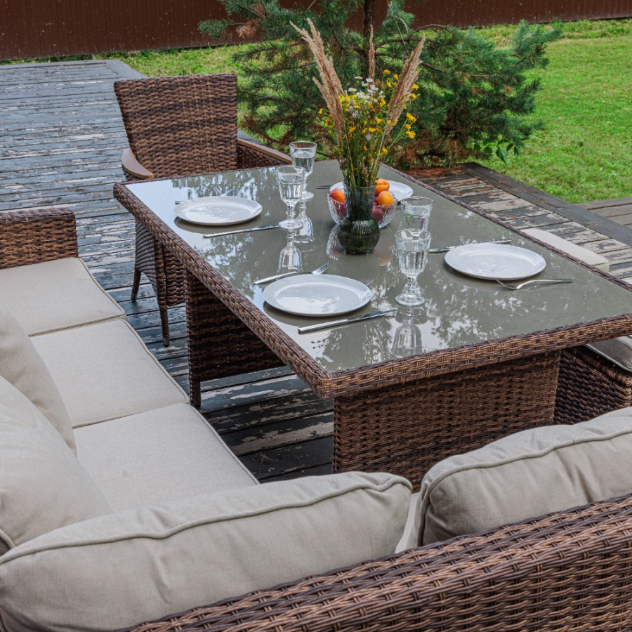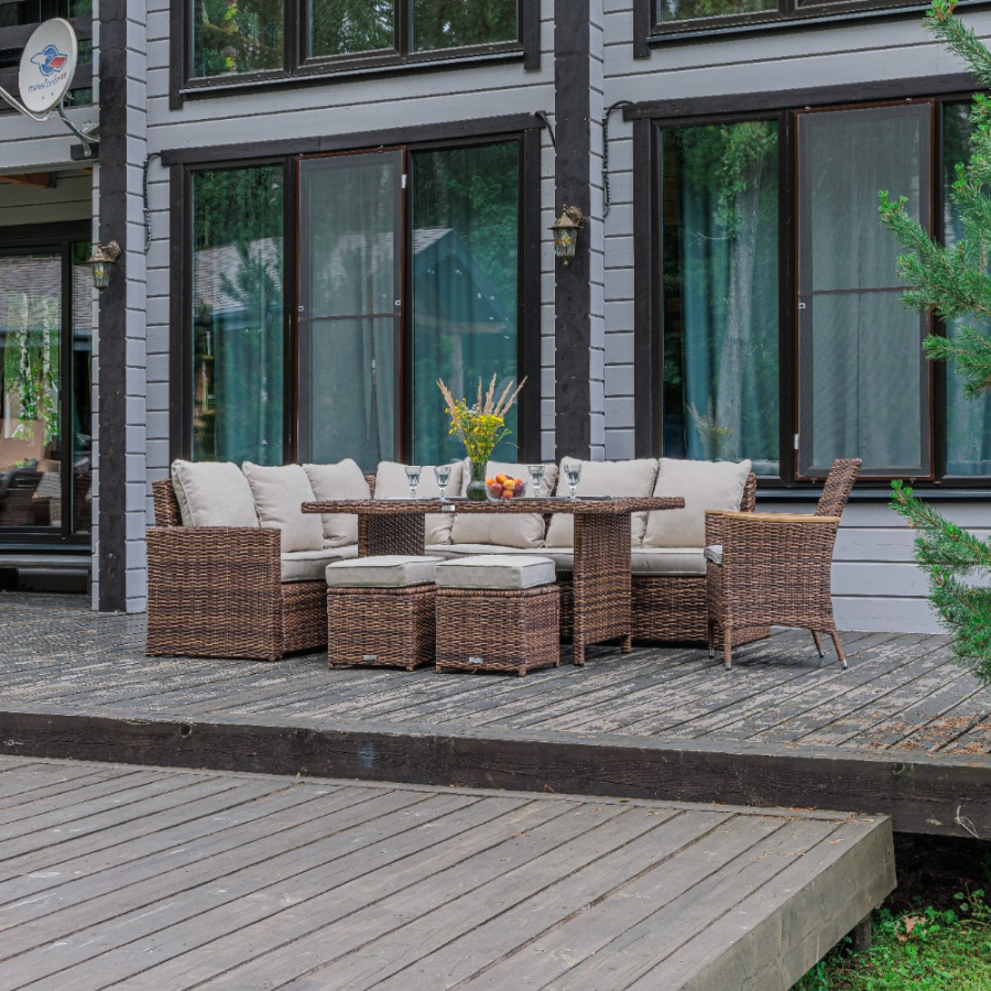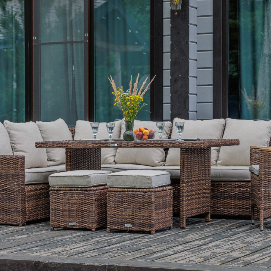 Комплектация и габариты: Диван прямой - 171x71x81 см Диван угловой- 183x71x81 см Кресло - 60х59х87 см Обеденный стол - 150x90x70 см Пуф (2 шт) - 40x40x33 см Подушки под спину (7 шт) - 53х48х22 см Подушки для сиденья (6 шт) - 60х10х56 см Подушки для сиденья на кресло (1 шт) 47х7х44 см Подушка для сиденья на пуф (2 шт) - 40х10х40 см Материалы: Материал комплекта - искусственный ротанг (ручного плетения) Материал каркаса – сталь, окрашенная порошковым методом Материал столешницы - закаленное стекло Материал подлокотников кресла - поливуд (искуссвенное дерево) Материал чехла на подушки - олефин (водоотталкивающая ткань) Материал наполнителя подушек под спину - синтетический пух Материал наполнителя подушек для сидения - поролон Цвет комплекта - коричневый Цвет подушек - бежевый Дополнительная информация: Количество посадочных мест – 8-10 человек Максимальная нагрузка на посадочное место - 150 кг Чехлы съемные - да Температурный режим - от -50?C до +50?C Сочетается с комплектами бренда ROYAL FAMILY - ZOYA, KARL, GRAND VICKY, FIONA, VIOLETTA в коричневом цвете Накладки на ножки - да (пластиковые) Категория ротанга - первичная Держатели и крепления подушек зависят от поставки и не являются неотъемлемой частью комплекта Гарантия и эксплуатация: Гарантийный срок - 1 год Эксплуатационный срок - 10 лет Страна производитель - КитайХарактеристики