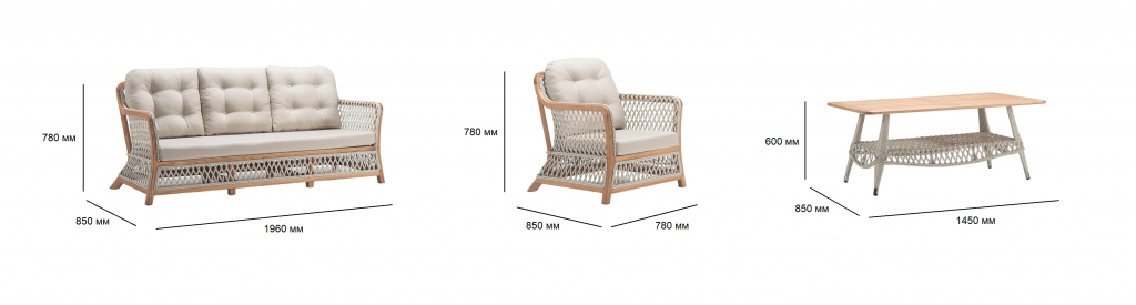 Комплект плетеной лаунж мебели Melisa – это изумительное решение для обустройства зоны отдыха как в сфере Contract, так и в частном проекте. Благодаря деревянному каркасу мебель обладает прочностью и надежностью, а за счет плетения из полиэтиленового волокна ее можно использовать на открытых пространствах, не боясь потери эстетического привлекательного внешнего вида, и с сохранением целостности конструкции. Подушки на сиденьях дивана и кресел обеспечивают очень комфортную и удобную посадку. Состав комплекта: Кресло, размер 780х850х780 мм - 2 шт. Диван трехместный, размер 1960х850х780 мм - 1 шт. Столик кофейный, размер: 1450х850х600 мм - 1 шт. Особенности: Каркас мебели может быть выполнен из древесины ироко или каштана класса А. Ироко имеет плотность 660 кг/м3 и степень сухости 94%, регион происхождения - Африка. Каштан имеет плотность 540 кг/м3 и степень сухости 93%, регион происхождения - Турция. Операции резки, фрезерования и шлифования выполняются на современных деревообрабатывающих станках, а перед сборкой дорабатываются ручным трудом профессиональных мастеров по дереву. Плетение выполнено из искусственного ротанга - волокон, импортируемых Wintec, компанией, которая является мировым лидером в области производства садовой мебели. Материал на 97% состоит из полиэтилена (ПЭ) и содержит УФ-добавки, безвредные для здоровья человека, дающие устойчивость к воде, дождю, ветру, влажности, холоду и солнцу. Синтетический ротанг предотвращает такие негативные ситуации, как заражение насекомыми и гниение, которые часто наблюдаются в садовой мебели. Материал успешно прошел испытания на устойчивость, растрескивание и сушку. Наполнитель подушек - пенополиуретан, обеспечивающий комфортное пребывание благодаря своей неравномерной клеточной структуре, поглощающей давление в области сиденья и спины. Такой материал сохраняет свои качества дольше по сравнению со стандартными губками. Обивка подушек выполнена из ткани высшего класса - 100% олефина, подходящего для использования на открытом воздухе, водостойкого при любых погодных условиях. Ткань успешно прошла 7 различных испытаний на устойчивость к свету, погодным условиям, ультрафиолету, стирке, морской воде, воде из бассейна и царапинам. Открыть инструкцию по уходу. Цена на сайте указана за модель с каркасом из каштана. Для уточнения всех возможных вариантов материала и цвета данного изделия обращайтесь к нашим менеджерам.Характеристики