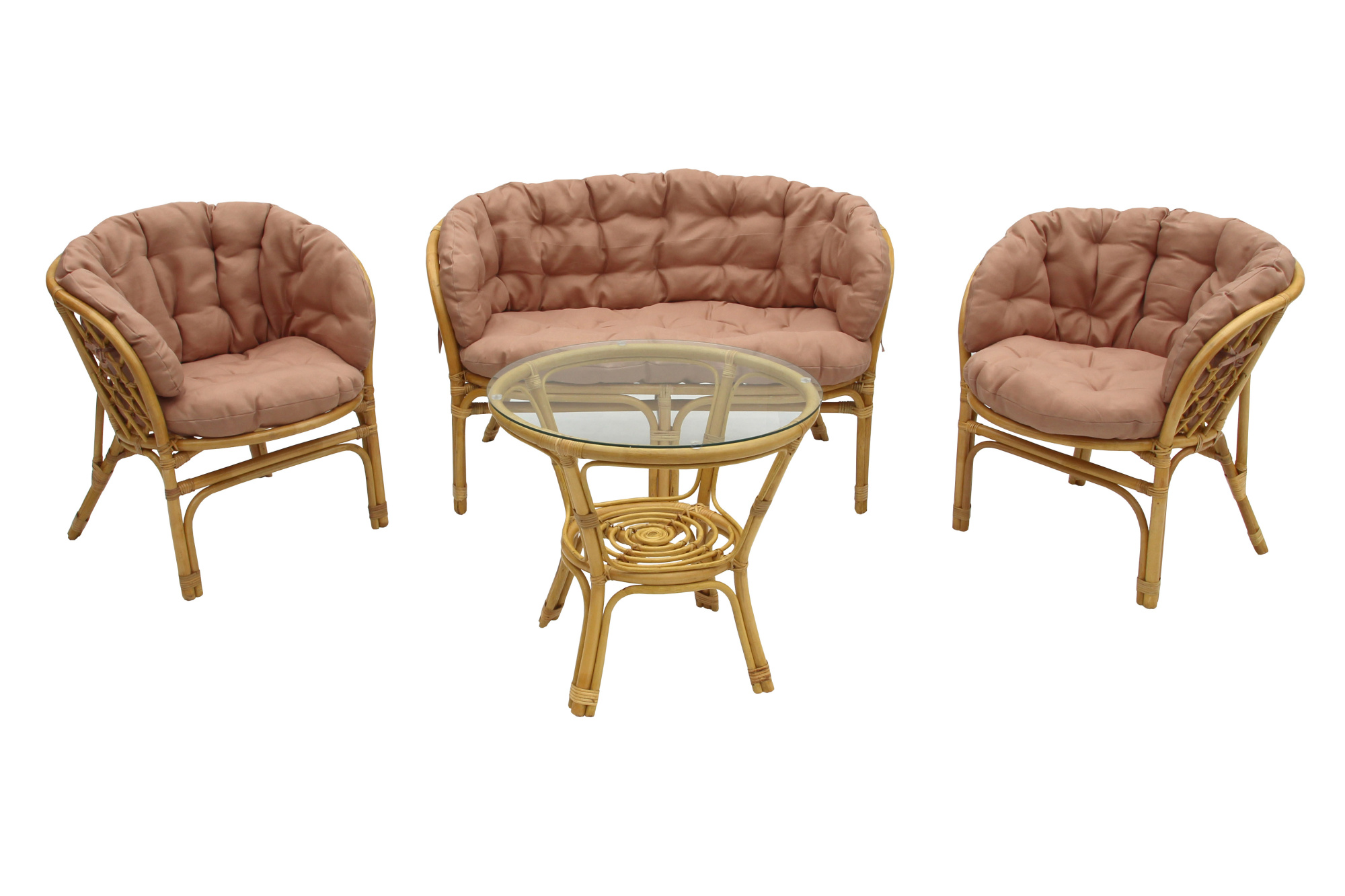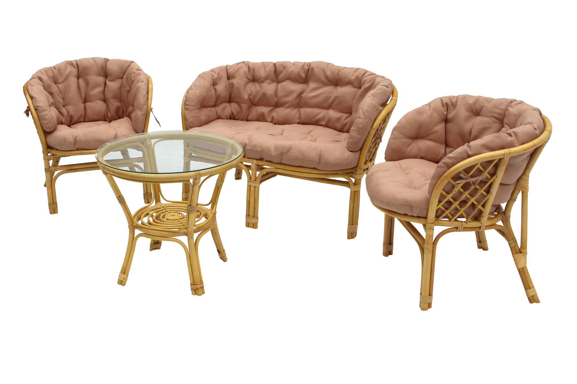 Габариты элементов (Ш/ГхДхВ) : стол: 60х60х56 кресло: 71х71х76 диван: 116х71х76 Цвет каркаса : медовый Материал каркаса : ротанг натуральный Цвет чехла мягкого элемента/матраса : бежевый Узор ткани : без рисунка Материал чехла мягкого элемента : полиэстер+хлопок Толщина мягкого элемента : 9 Цвет поверхности : медовый Материал поверхности : ротанг натуральный, стекло Комплектация : стол, 2 кресла, диван Страна производства : ИНДОНЕЗИЯ Дополнительно : Класс ротанга А.Глубина сиденья 52см, высота от пола до сиденья 40см. Подушки упакованы в полиэтиленовой пакет по 2 штуки (спинка+сиденье). Чехлы не съемные, материал влагооталкивающий, сухая чистка. Стекло 5 мм, нагрузка на стол до 30 кг.Характеристики