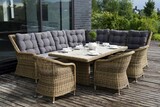 Угловая модульная лаунж-зона с обеденным столом и тремя стульями. В состав входят: - модульный диван (правый модуль - 1150×900×990 мм, левый модуль - 1150×900×990 мм, угловой модуль - 1630×900×990 мм, центральный модуль - 570×900×990 мм). - плетеный обеденный стол (1800×1000×680 мм). - кресло 3 шт. - (570×680×810 мм). Столешница выполнена из современного полимерного материала ДПК в тон ротанга. Каркас изготовлен из прочного и легкого металла – алюминия, вручную оплетенного искусственной ротанговой лозой натурального соломенного оттенка. Модульный диван и кресла изготовлены посредством ручного плетения из искусственного ротанга соломенного цвета. Для укрепления конструкции использован алюминиевый каркас. В комплекте - подушки со съёмными чехлами. Они обработаны влагоотталкивающей пропиткой, не пропускают случайно пролитую жидкось. "Бергамо" плетеный угловой диванный модуль, цвет соломенный 1шт. 1 630Х900Х990, "Бергамо" плетеный левый модуль дивана, цвет соломенный 1шт. 1 150Х900Х990, "Бергамо" плетеный правый модуль дивана, цвет соломенный 1шт. 1 150Х900Х990, "Бергамо" плетеный центральный модуль дивана, цвет соломенный 1шт. 570Х900Х990, "Бергамо" плетеный обеденный стол, цвет соломенный 1шт. 1 800Х1 000Х680, "Равенна" плетеное кресло из искусственного ротанга, цвет соломенный 3шт. 570Х680Х810,Характеристики