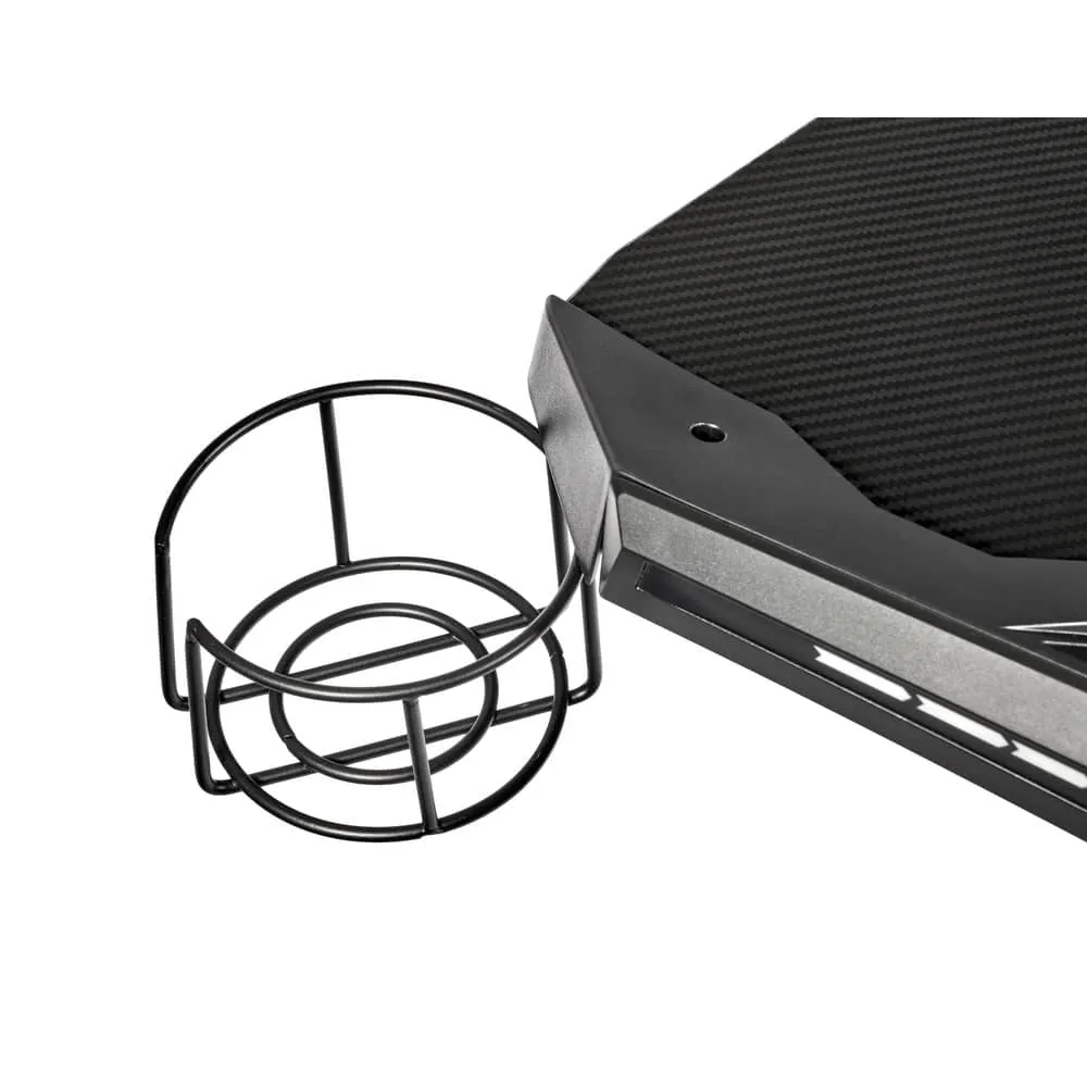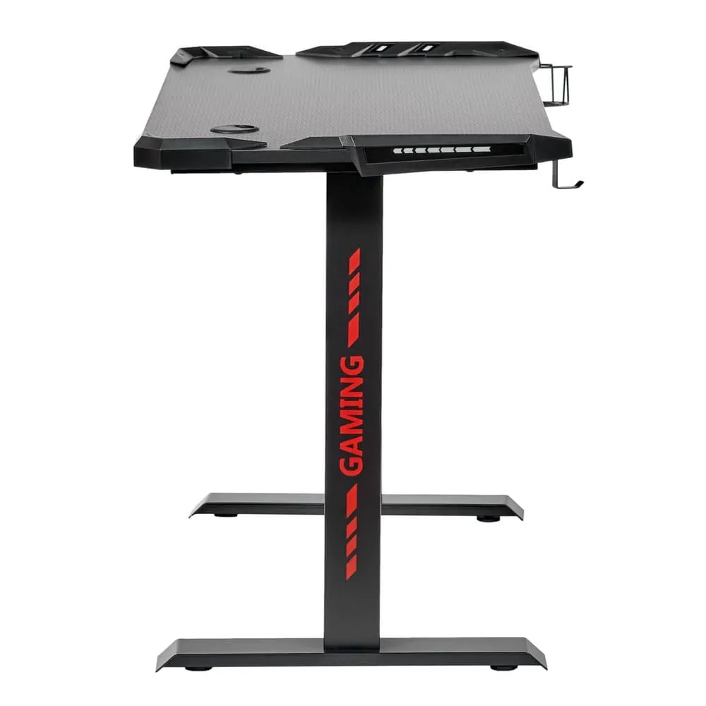 Поверхность стола не скользкая, устойчивая к загрязнениям, мелким царапинам. На столешнице можно расположить все необходимое: письменные принадлежности, документы, игровые девайсы, настольную лампу. В конструкции предусмотрено 2 отверстия для проводов, а также подстаканник и крючок для наушников.