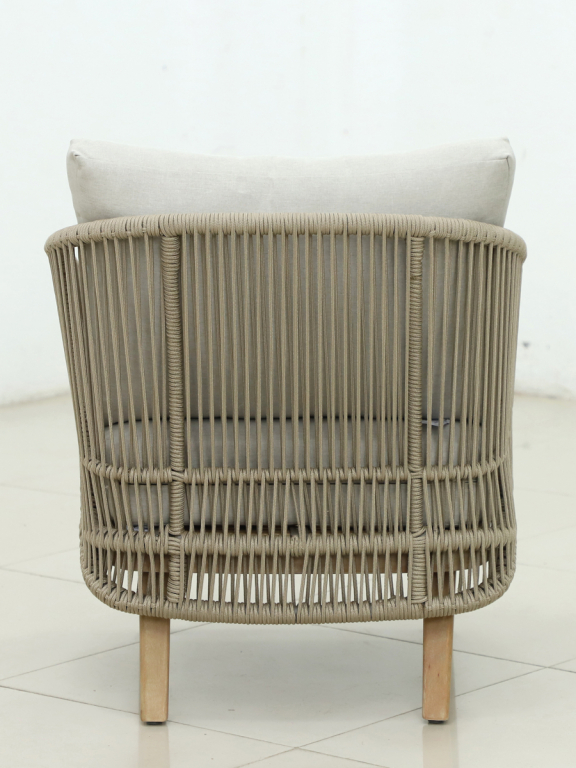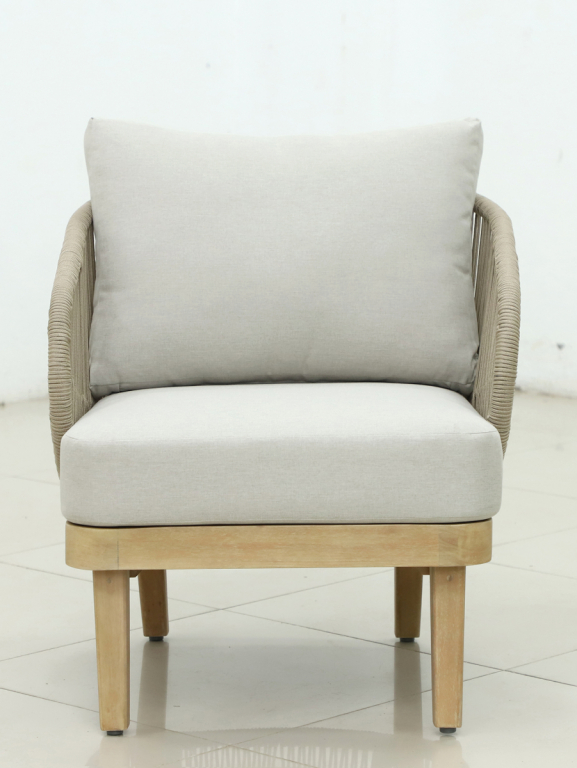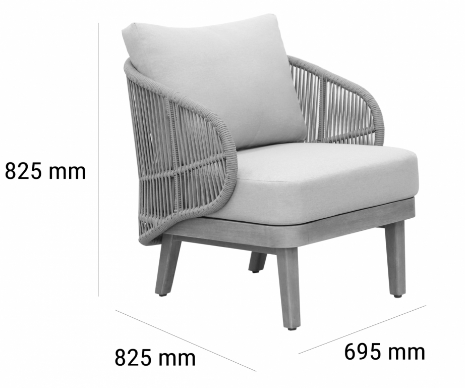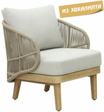 Эксклюзивная коллекция Mali приглашает вас окунуться в стиль и безмятежность на открытом воздухе. Кресла, вдохновленные побережьем, имеют прочный алюминиевый каркас, оплетенный роупом, очаровательные ножки из эвкалипта и мягкие, удобные подушки, предназначенные для круглогодичного отдыха на открытом воздухе и развлечений. Особенности: Материал - ЭВКАЛИПТ, отделка экомаслом тик Light #01A. Древесина, из которой изготовлена мебель, имеет сертификацию FSC (Forest Stewardship Council) - гарантия качества и происхождения древесины. Знак FSC - показатель того, что продукция происходит из леса, в котором ведется экологически и социально ответственное лесное хозяйство. Благодаря своей долговечности, прочности и устойчивости к вредителям эта древесина была создана для изготовления садовой мебели. Страна происхождения древесины: Уругвай. Средняя плотность древесины: 550-600 кг/м3. Плетение выполнено из роупа VPR - PR559. Подушки в комплекте, ткань подушек - полиэстер SK222. Материалы устойчивы к УФ-излучению и другим погодным воздействиям. Наполнение подушек - формованный пенополиуретан (foam) - этот материал очень мягкий и комфортный, быстро быстро восстанавливает первоначальную форму. Открыть инструкцию по уходу. Вся деревянная мебель должна обрабатываться специальным маслом или пропиткой минимум 1 раз в 6 месяцев (в условиях высокой влажности обработку следует проводить чаще). Для данной мебели не рекомендуются резкие температурные перепады. Дерево является натуральным материалом, поэтому любые трещины, неравномерные природные рисунки, различность оттенков ‐ являются естественным процессом, который вызван температурными изменениями или влажностью.Характеристики