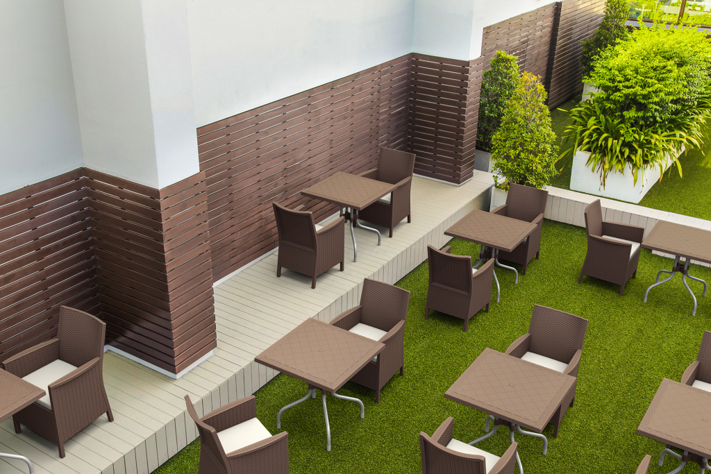 Вы можете купить Кресло пластиковое плетеное с подушкой Siesta Contract California, коричневый оптом в нашем магазине, предложим цену с оптовой скидкой.