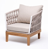 Плетеное кресло «Диего» с подушками в комплекте. Основание кресла - дуб, каркас из алюминия светло-серого (RAL7035) цвета. Боковины каркаса вручную оплетены роупом - эластичными синтетическими лентами, изготовленными из высокопрочных полиэфирных волокон. Цвет оплетки - бежевый. Подушки со съёмными чехлами, которые обработаны влагоотталкивающей пропиткой. Материал - 100% полиэстер, плотностью 300гр/м2. Размер кресла: 770×720×800 мм.Характеристики