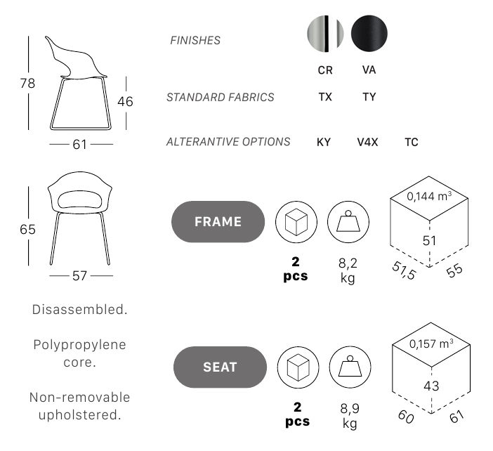 Lady B - это кресло с подлокотниками с эксклюзивным и современным дизайном. Элегантные и тонкие линии Lady B украшены и еще более подчеркнуты в его Pop Sledgeверсии с тканевым вариантом отделки и ножками в виде полозьев. Эти характеристики идеально совпадают с высоким уровнем комфорта и практичности, которые всегда отличали все продукты бренда Scab Design. Особенности: Каркас кресла изготовлен в виде полозьев из трубчатой стали диаметром 11 мм. Варианты отделки: окрашенная сталь, хромированная сталь. Корпус оснащенподлокотниками, отлитиз полипропилена иобит тканью.Доступные категории: T, K, V4. Удобное, обволакивающее и мягкое креслорекомендовано для обстановки кухонь, обеденных зон, современных жилых комнат дома, а также для более интенсивного использования в ресторанах, пиццерияхили барах. Кресло предлагается в нескольких цветовых сочетаниях конструкции ножек и сиденья и тканевым покрытием. Возможная отделка сидения: ткань, водооттакливающая ткань, огнестойкая ткань, огнестойкий вельвет. Данная модель предназначена для использования во внутреннем интерьере кафе и ресторанов. Открыть каталог отделоки обивок. Открыть технические характеристики. Цена на сайте указана за модель с обивкой из водоотталкивающей ткани и окрашенным каркасом .Цены на другие модели Вы можете уточнить у менеджеров.Характеристики