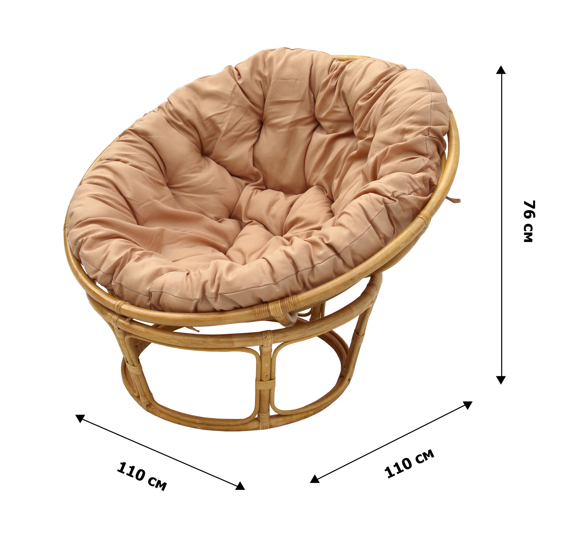 Габариты изделия (Ш/ГхДхВ) : 110х110х76 Количество штук в упаковке : 1 Цвет каркаса : медовый Материал каркаса : ротанг натуральный Покрытие : лак Цвет чехла мягкого элемента/матраса : бежевый Цвет поверхности : медовый Материал поверхности : ротанг натуральный Допустимая нагрузка : 100 Требуется сборка : Да Страна производства : ИНДОНЕЗИЯ Гарантийный срок : 12 Дополнительно : Класс ротанга А. Ремни в комплекте. От пола до сиденья 37см, глубина сиденья (от центра с углублением) 67см, глубина спинки (от центра с углублением) 67см. Подставка D низ 66см, D верх 81см.Характеристики