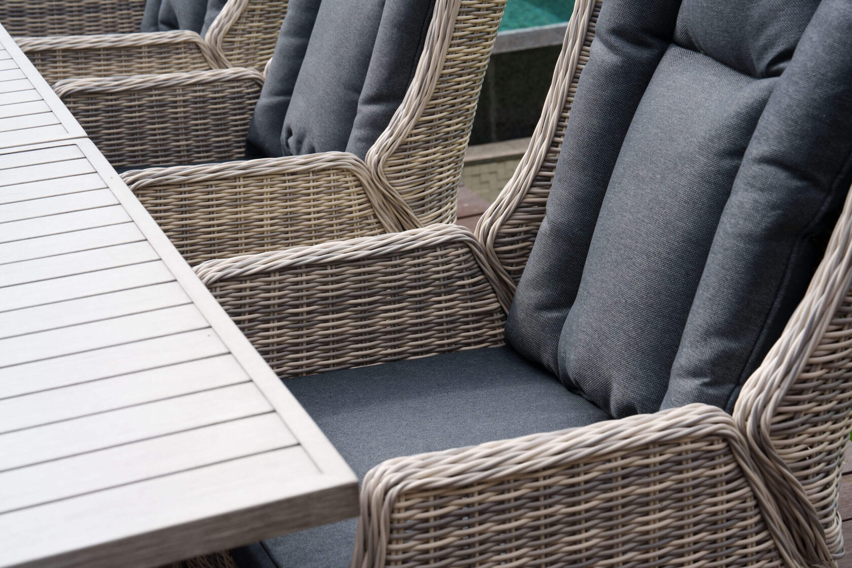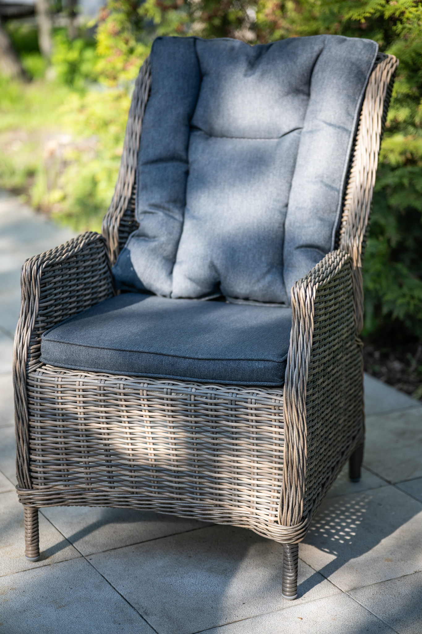 Регулируемое кресло из искусственного ротанга ВЕРОНА в комплекте с подушками! Новинка — кресло ВЕРОНА с регулируемой спинкой и необыкновенно мягкими подушками просто создана для расслабляющего отдыха! Каркас кресел изготовлен из алюминия, легкий прочный материал. Покрытие кресел — искусственное плетение имитирующее ротанг Материал: Искусственный ротанг Вид мебели: Кресла. Каркас кресел из алюминия. Покрытие кресел - искусственное пластиковое плетение имитирующее ротанг Размеры: Ш-62, Г-57, В-105см; 83см- от верхнего края спинки и до конца сидения; Вес 14,5кг Размер подушки сидения. - 50*54*6см Допустимая нагрузка — 130кг Цвет: чехол подушек синий Подушка: из водоотталкивающей ткани высокого качества.Характеристики