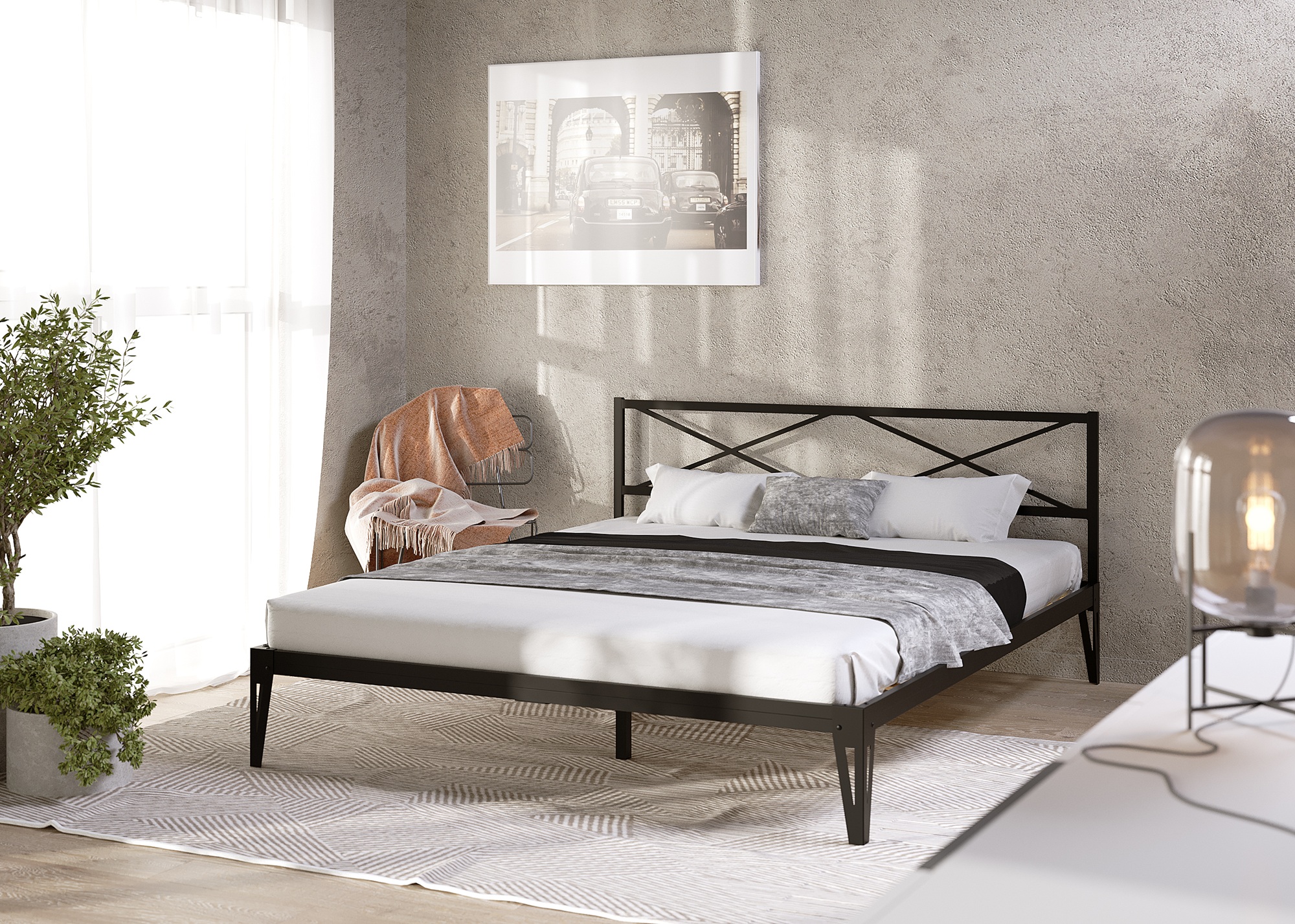 Металлическая кровать Тея. Добавляет в интерьер легкости. Металлическая кровать отличается устойчивостью и долговечностью. Материал спинок: металл Материал ножек: металл Цвет спинок: черный (RAL 9005) Цвет ножек: чёрный (RAL 9005) Максимальная нагрузка: 400 кг Габариты (ДхШхВ) см: 206х146х90,5 Габариты спального места (ДхШ) см: 200х140 Высота спального места: 24,5 см Высота изножья: 46,5 см Высота изголовья: 90,5 см Максимальная равномернораспределенная нагрузка на кровать шириной 1200-1800мм не более 400 кг..Характеристики