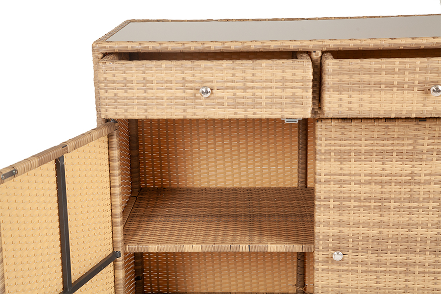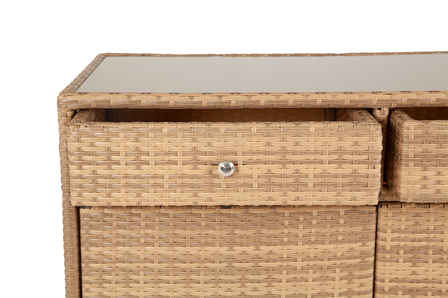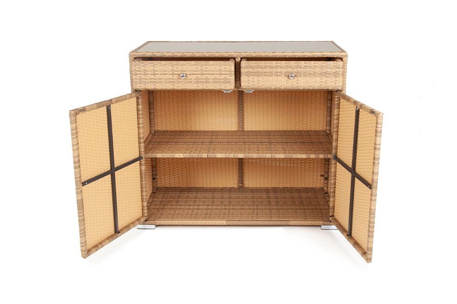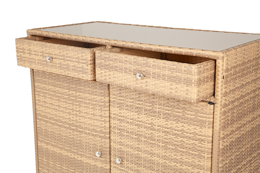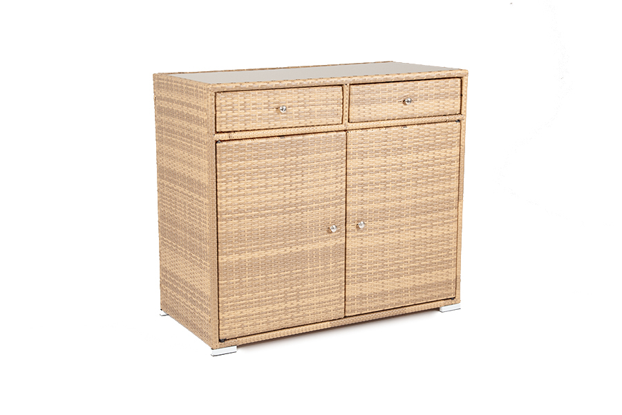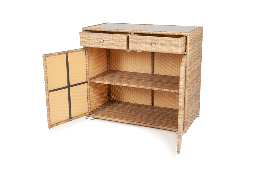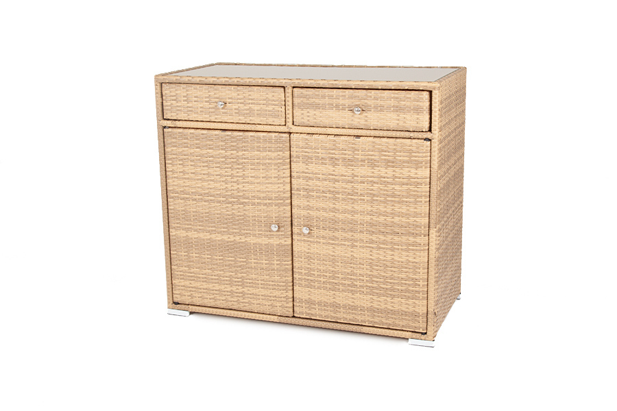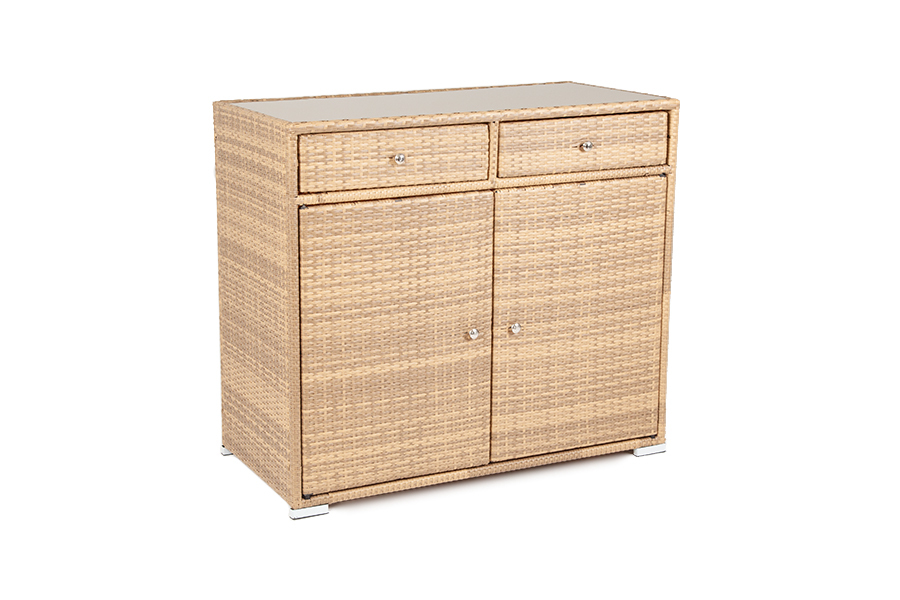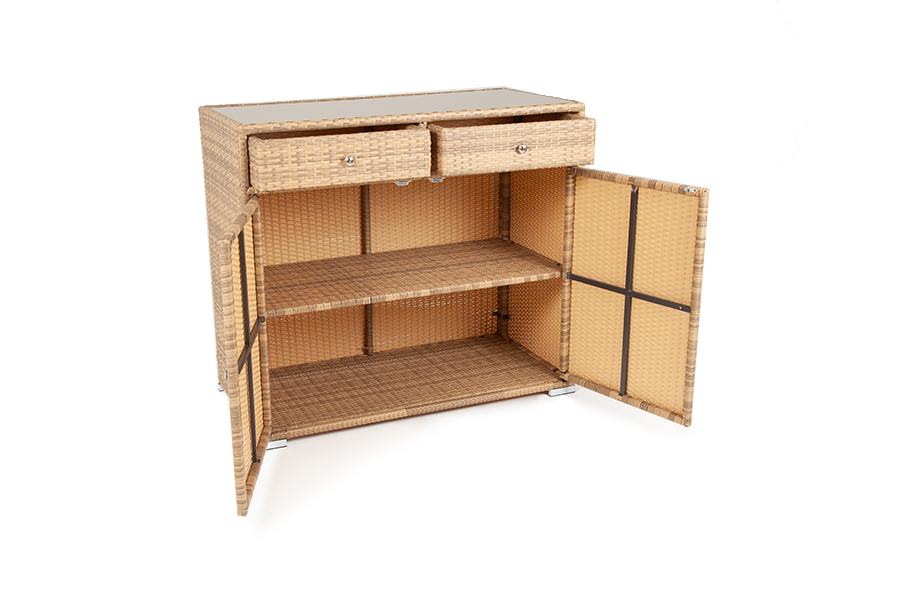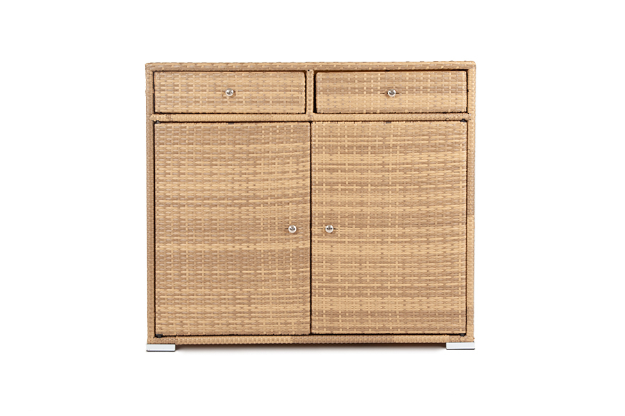 «Мальта» тумба изготовлена из алюминиевого каркаса, оплетенного плоским искусственным ротангом соломенного цвета. Размер - 1160×560×1020 мм. Тумба оснащена двумя выдвижными ящиками и двумя полками внутри. Закрывается на распашные дверцы.