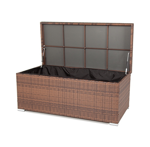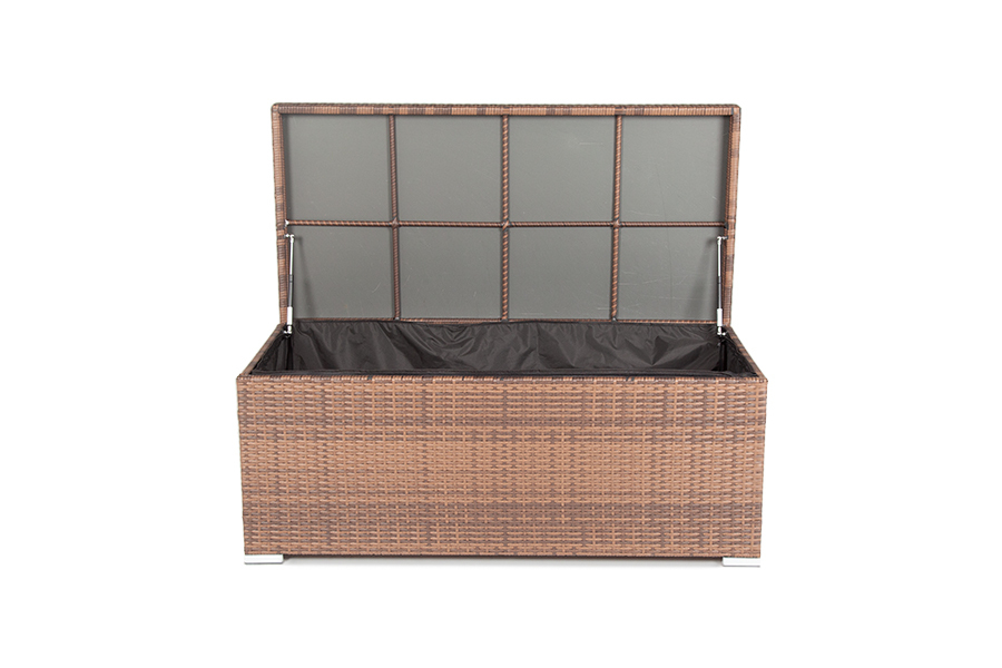 «Порту» вместительный сундук из плоского искусственного ротанга коричневого оттенка. В основе - алюминиевый каркас. Размер: 1400×700×600 мм. Сундук предназначен для хранения текстильных изделий, водонепроницаем, поэтому можно использовать на улице, не боясь осадков.