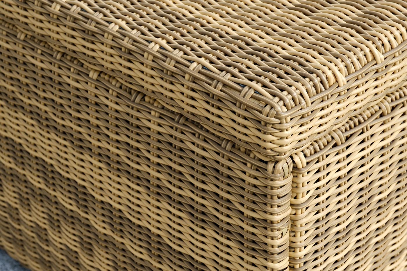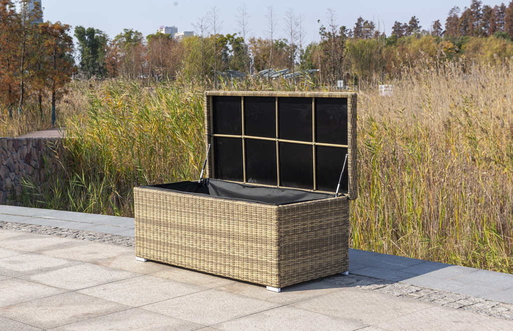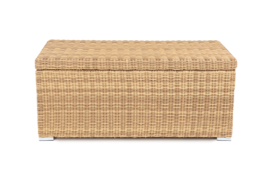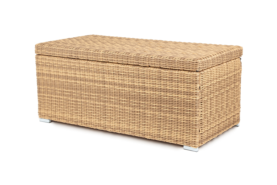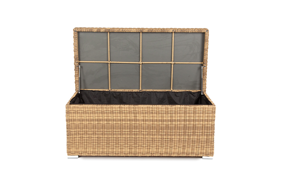 «Порту» вместительный сундук из плоского искусственного ротанга соломенного оттенка. В основе - алюминиевый каркас. Размер: 1400×700×600 мм. Сундук предназначен для хранения текстильных изделий, водонепроницаем, поэтому можно использовать на улице, не боясь осадков.