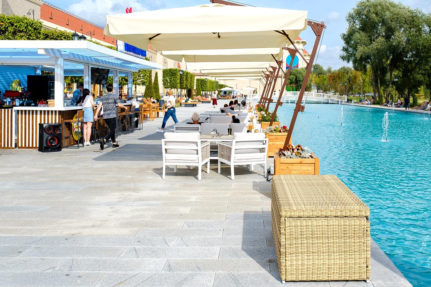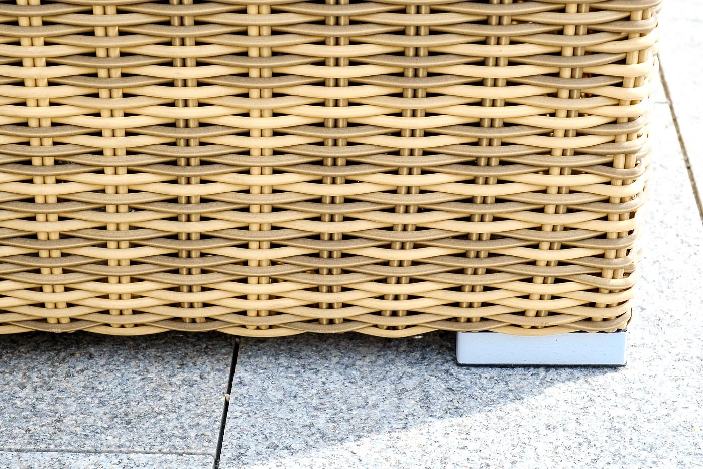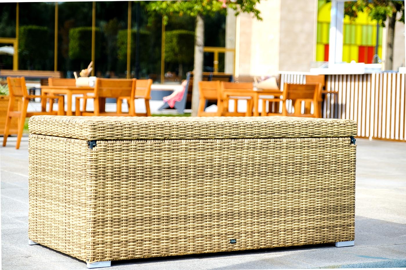 «Порту» вместительный сундук из плоского искусственного ротанга соломенного оттенка. В основе - алюминиевый каркас. Размер: 1400×700×600 мм. Сундук предназначен для хранения текстильных изделий, водонепроницаем, поэтому можно использовать на улице, не боясь осадков.