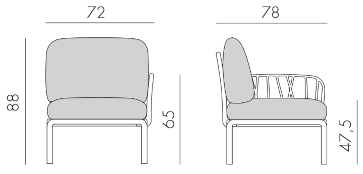 Дизайн: Raffaello Galiotto. На выставке Salone del Mobile 2018 в Милане Nardi представили новую коллекцию модульной мебели Komodo, куда входят различные модульные элементы, благодаря которым можно создавать различные комбинации. Модули Komodo выполнены из стеклопластика, имеют складные спинки и боковины, съемные подушки, благодаря чему можно составить диван любой длины, превратить отдельные модули в столики или пуфы. Ветвистая переплетенная конструкция вытекает из строгого геометрического дизайна, который также включает инновационную систему соединения между спинкой и сиденьем, осуществленную с помощью простого вращения. Последнее решение позволяет избежать непривлекательных стыков и открытых отверстий и поддерживает эстетическую гармонию плетеной конструкции на сиденье и спинке. Особенности: Модуль левый/правый включает в себя: 1 сиденье, 1 спинку, 1 подлокотник, 1 подушку на сиденье, 1 подушку на спинку, 1 подушку на подлокотник. Модель выполнена из полностью перерабатываемого материала - стеклопластика (полипропилен, стекловолокно) - прочного, нетоксичного и антистатичного, устойчивого к любой погоде и средам с повышенной соленостью. Сиденья можно закрепить с одной стороны, а спинки и подлокотники можно прикрепить с любой стороны. Возможные цвета каркаса: белый (bianco), антрацит (antracite), тортора (tortora), агава (agave). Возможные цвета подушек из акрила: серый (grigio), розовый (rosa quarzo). Возможные цвета подушек из ткани Sunbrella: синий (adriatic), лед (ghiaccio), авокадо (avocado), джунгли (giungla), холст (canvas). Возможные цвета подушек из ткани TECH: панама (panama). Матовая отделка, нескользящие ножки. Изделие сертифицировано CATAS. Открыть технические характеристики. Открыть инструкцию по сборке. Элементы серии Кomodo можно комбинировать между собой в любой последовательности, создавая индивидуальные решения для Вашего интерьера.Характеристики