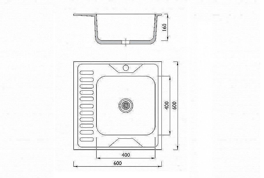 Кухонная накладная мойка с большой чашей и широкими полями. Подходит для тумб 600 мм. Чаша снаружи покрыта шумопоглащающей пленкой. Отверстие под смеситель по центру чаши. Выпускается с переливом для воды в чаше. В комплект входит: сифон с переливом.