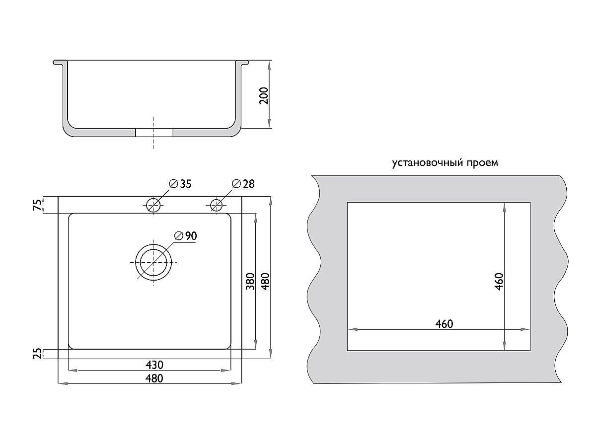 Кухонная врезная мойка с одной прямоугольной чашей. Подходит для тумб от 500 мм. У чаши есть шумопоглощающая обработка. Площадка под смеситель и дозатор в верхней части мойки, выпускается с переливом для воды в чаше. В комплект входит: сифон с переливом и гофрой, крепеж.Характеристики