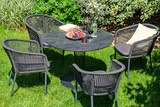 Обеденная группа «Диего» для интерьерных решений. Состоит из ккруглого обеденного стола со столешницей, диаметром 90см. Материал столешницы выполнен из высококачественного монолитного компакт-пластика HPL в цвете «серый гранит». Подстолье - нержавеющая сталь черного цвета. 4 кресла из коллекции «Марсель», выполненных из алюминиевого каркаса и ручной оплетки роупом. Это эластичные синтетические ленты из высокопрочных полиэфирных волокон, представлены в темно-сером цвете. В комплект также входят подушки с влагоотталкивающими съёмными чехлами, цвет аналогичный темно-серый. Возможно изготовление стола любого размера и формы по индивидуальному заказу. "Марсель" стул плетеный из роупа, каркас алюминий темно-серый (RAL7024) муар, роуп темно-серый круглый, ткань темно-серая 027 4шт. 570Х620Х775, "Диего" обеденный стол из HPL круглый Ø90см, цвет "серый гранит" 1шт. 900Х900Х750,Характеристики