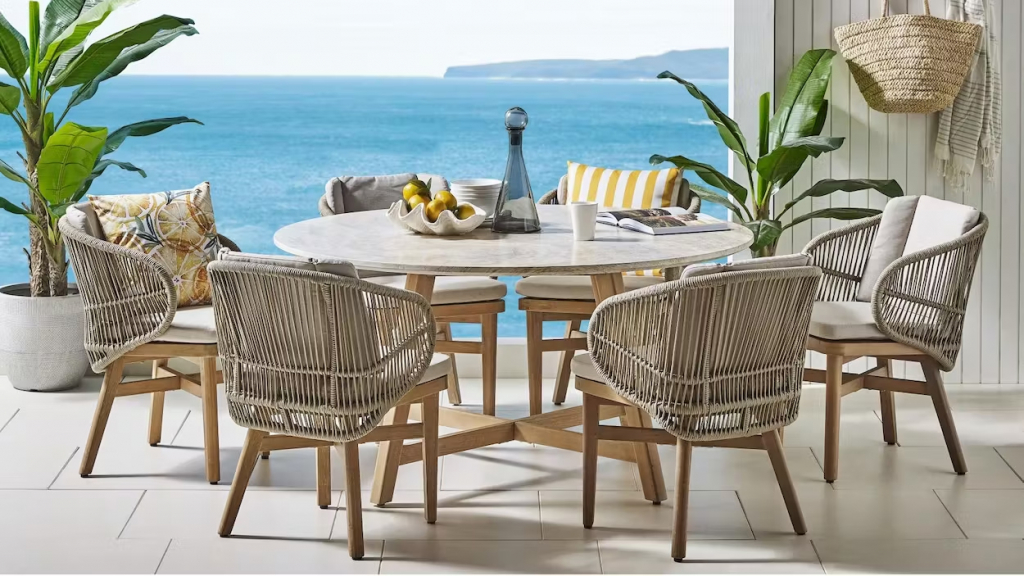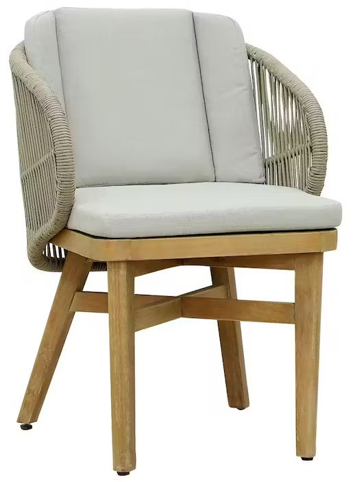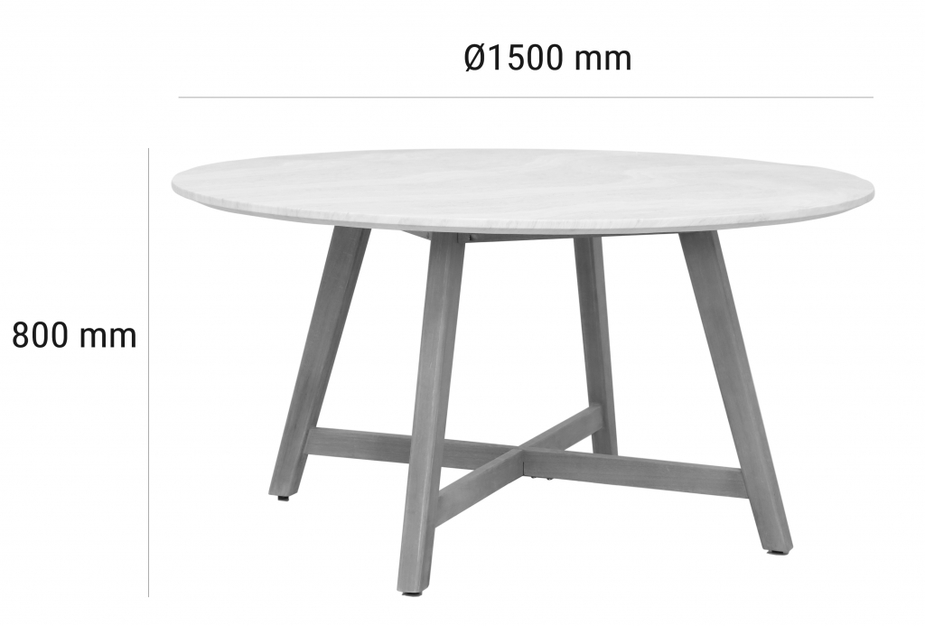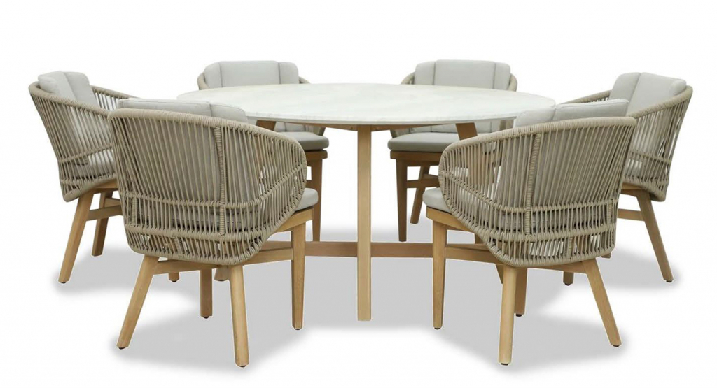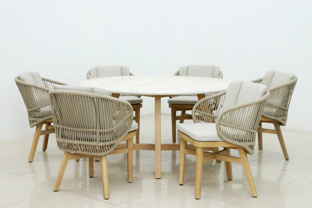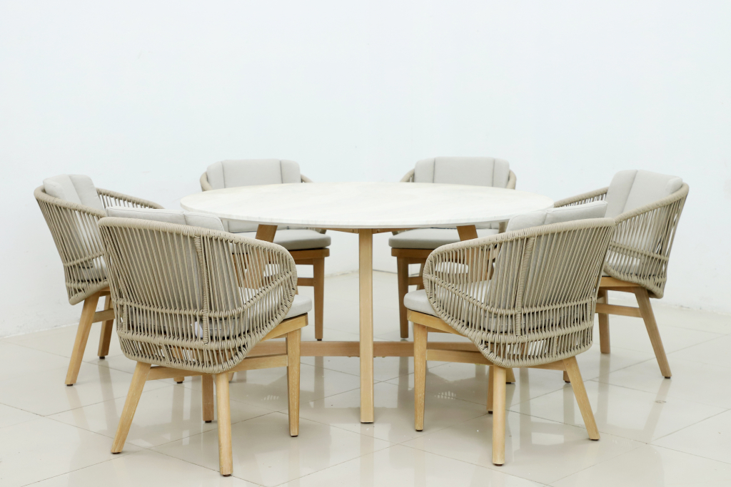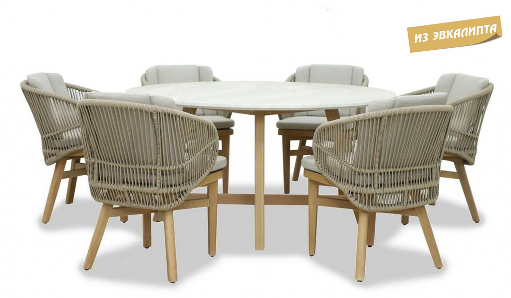 Эксклюзивная коллекция Mali приглашает вас окунуться в стиль и безмятежность на открытом воздухе. Обеденные кресла, вдохновленные побережьем, имеют прочный алюминиевый каркас, оплетенный роупом, очаровательные ножки из эвкалипта и мягкие, удобные подушки, предназначенные для круглогодичного отдыха на открытом воздухе и развлечений. Большой обеденный стол, рассчитанный на 6 персон, выполнен из эвкалипта, круглая столешница - из искусственного камня Travertine. Этот ансамбль из эвкалипта с обеденным столом с оригинальной столешницей и шестью мягкими креслами с плетением из роупа, создан для незабываемых моментов на свежем воздухе. Особенности: Материал - ЭВКАЛИПТ, отделка экомаслом тик Light #01A. Древесина, из которой изготовлена мебель, имеет сертификацию FSC (Forest Stewardship Council) - гарантия качества и происхождения древесины. Знак FSC - показатель того, что продукция происходит из леса, в котором ведется экологически и социально ответственное лесное хозяйство. Благодаря своей долговечности, прочности и устойчивости к вредителям эта древесина была создана для изготовления садовой мебели. Страна происхождения древесины: Уругвай. Средняя плотность древесины: 550-600 кг/м3. Столешница обеденного стола выполнена из искусственного камня Travertine. Плетение на креслах выполнено из роупа VPR - PR559. Подушки в комплекте, ткань подушек - полиэстер SK222. Материалы устойчивы к УФ-излучению и другим погодным воздействиям. Наполнение подушек - формованный пенополиуретан (foam) - этот материал очень мягкий и комфортный, быстро быстро восстанавливает первоначальную форму. Состав комплекта: Кресло (арт. TAG/HUC39801), размер: 590х622х795 мм - 6 шт. Обеденный стол со столешницей Travertine (арт. TAG/HUC28356), размер: Ø1500х800 мм - 1 шт. Данные упаковки: Кресло: Вес нетто: 12.2 кг. Вес брутто: 14.2 кг. Размер упаковки: 690х610х440 мм. Объем упаковки: 0.179 м3. Количество в упаковке: 1 шт. Подстолье: Вес брутто: 14 кг. Объем упаковки: 0.16 м3. Количество в упаковке: 1 шт. Столешница: Вес брутто: 97 кг. Объем упаковки: 0.342 м3. Количество в упаковке: 1 шт. Открыть инструкцию по уходу. Вся деревянная мебель должна обрабатываться специальным маслом или пропиткой минимум 1 раз в 6 месяцев (в условиях высокой влажности обработку следует проводить чаще). Для данной мебели не рекомендуются резкие температурные перепады. Дерево является натуральным материалом, поэтому любые трещины, неравномерные природные рисунки, различность оттенков ‐ являются естественным процессом, который вызван температурными изменениями или влажностью.Характеристики