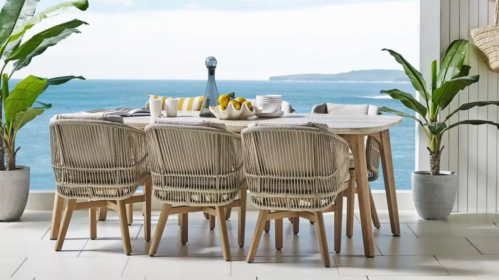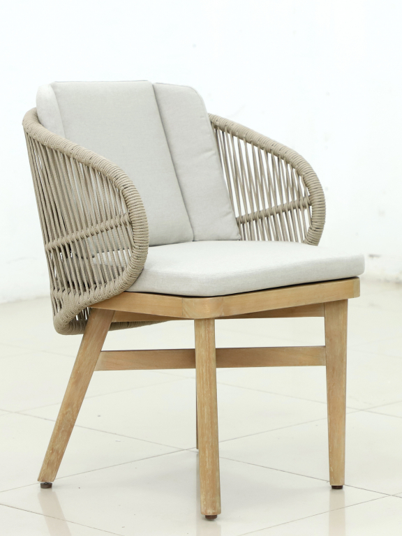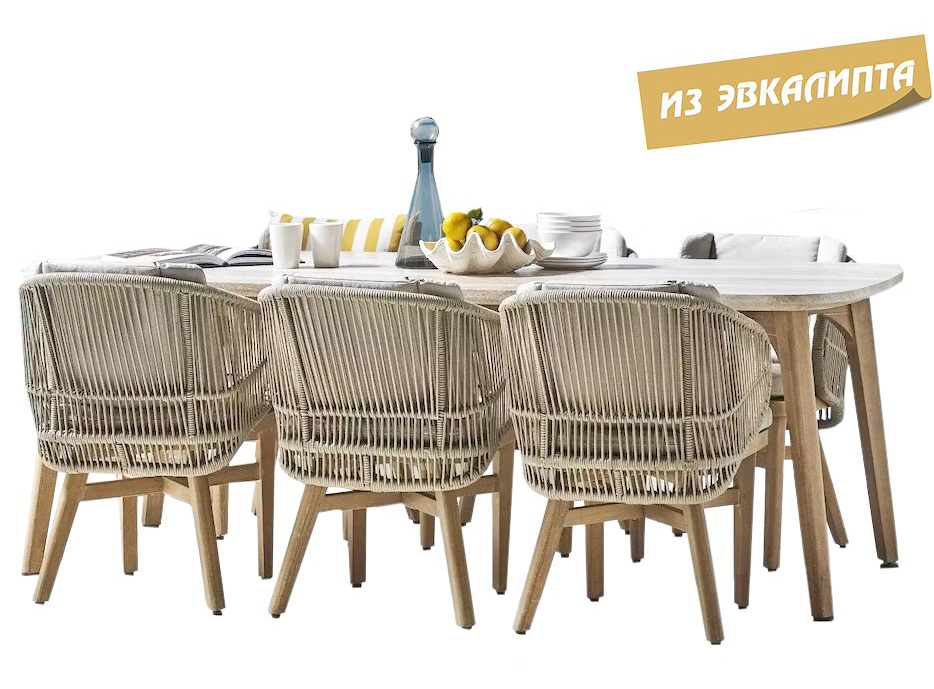 Эксклюзивная коллекция Mali приглашает вас окунуться в стиль и безмятежность на открытом воздухе. Обеденные кресла, вдохновленные побережьем, имеют прочный алюминиевый каркас, оплетенный роупом, очаровательные ножки из эвкалипта и мягкие, удобные подушки, предназначенные для круглогодичного отдыха на открытом воздухе и развлечений. Большой обеденный стол, рассчитанный на 6 персон, выполнен из эвкалипта, столешница с утонченным краем в виде акульего носа - из искусственного камня Travertine. Этот ансамбль из эвкалипта с обеденным столом с оригинальной столешницей и шестью мягкими креслами с плетением из роупа, создан для незабываемых моментов на свежем воздухе. Особенности: Материал - ЭВКАЛИПТ, отделка экомаслом тик Light #01A. Древесина, из которой изготовлена мебель, имеет сертификацию FSC (Forest Stewardship Council) - гарантия качества и происхождения древесины. Знак FSC - показатель того, что продукция происходит из леса, в котором ведется экологически и социально ответственное лесное хозяйство. Благодаря своей долговечности, прочности и устойчивости к вредителям эта древесина была создана для изготовления садовой мебели. Страна происхождения древесины: Уругвай. Средняя плотность древесины: 550-600 кг/м3. Столешница обеденного стола выполнена из искусственного камня Travertine. Плетение на креслах выполнено из роупа VPR - PR559. Подушки в комплекте, ткань подушек - полиэстер SK222. Материалы устойчивы к УФ-излучению и другим погодным воздействиям. Наполнение подушек - формованный пенополиуретан (foam) - этот материал очень мягкий и комфортный, быстро быстро восстанавливает первоначальную форму. Состав комплекта: Кресло (арт. TAG/HUC39801), размер: 590х622х795 мм - 6 шт. Обеденный стол со столешницей Travertine (арт. TAG/HUC38082-1), размер: 1700х900х790 мм - 1 шт. Данные упаковки: Кресло: Вес нетто: 12.2 кг. Вес брутто: 14.2 кг. Размер упаковки: 690х610х440 мм. Объем упаковки: 0.179 м3. Количество в упаковке: 1 шт. Подстолье: Вес брутто: 14 кг. Размер упаковки: 1240х455х190 мм. Объем упаковки: 0.128 м3. Количество в упаковке: 1 шт. Столешница: Вес брутто: 57 кг. Размер упаковки: 1810х1050х100 мм. Объем упаковки: 0.237 м3. Количество в упаковке: 1 шт. Открыть инструкцию по уходу. Вся деревянная мебель должна обрабатываться специальным маслом или пропиткой минимум 1 раз в 6 месяцев (в условиях высокой влажности обработку следует проводить чаще). Для данной мебели не рекомендуются резкие температурные перепады. Дерево является натуральным материалом, поэтому любые трещины, неравномерные природные рисунки, различность оттенков ‐ являются естественным процессом, который вызван температурными изменениями или влажностью.Характеристики