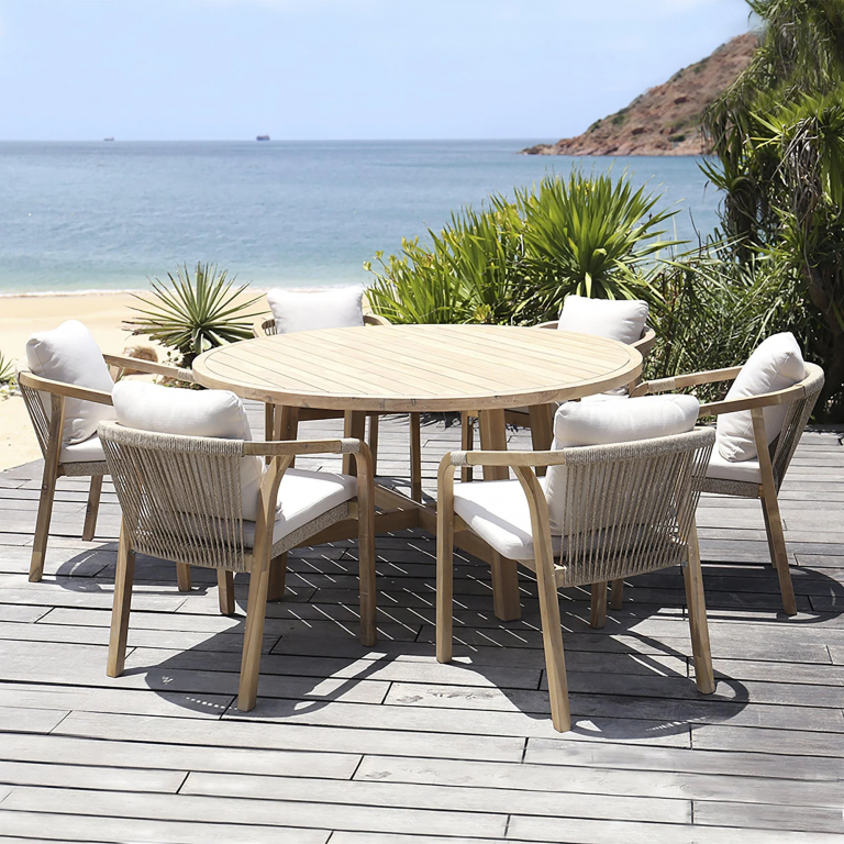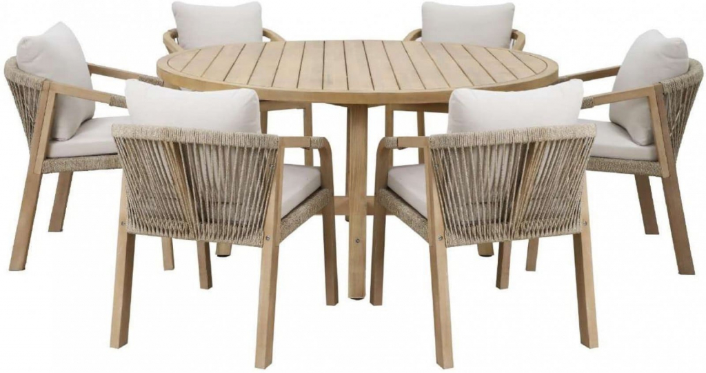 Обеденная группа Rimini, рассчитанная на 6 персон, - это садовая мебель из АКАЦИИ в современном стиле. Дизайнерские формы мебели из этой коллекции создадут стильный и узнаваемый облик зоны отдыха на вашей веранде. Rimini - это современная коллекция садовой мебели из акации, выполненная в комбинации натурального веревочного плетения роуп, акации и бежевых подушек. Цвет натуральной твердой древесины представляет собой натуральный цвет с мелкой текстурой, придающий древесине приятный теплый вид. Rimini - это стиль и элегантность на Вашей веранде. Особенности: Материал - АКАЦИЯ, отделка экомаслом тик Light #01A. Веревочное плетение роуп 6 мм толщиной на спинке и подлокотниках кресел излучает стиль в сочетании с деревянными поверхностями. Древесина, из которой изготовлена мебель, имеет сертификацию FSC (Forest Stewardship Council) - гарантия качества и происхождения древесины. Знак FSC - показатель того, что продукция происходит из леса, в котором ведется экологически и социально ответственное лесное хозяйство. Благодаря своей долговечности, прочности и устойчивости к вредителям эта древесина была создана для изготовления садовой мебели. Страна происхождения древесины: Вьетнам, Малайзия. Средняя плотность древесины: 550 кг/м3. Анодированная фурнитура из нержавеющей стали. Подушки в комплекте, ткань подушек - олефин, наполнитель - толстый поролон. Материалы устойчивы к УФ-излучению и другим погодным воздействиям. Цвет подушек - бежевый. Состав комплекта: Обеденный стол Rimini (Арт.HUC28207-1), размер Ø1500х750 мм - 1 шт. Кресло Rimini KD (Арт.HUC25690KD), размер 550х660х750 мм - 6 шт. Открыть инструкцию по уходу. Вся деревянная мебель должна обрабатываться специальным маслом или пропиткой минимум 1 раз в 6 месяцев (в условиях высокой влажности обработку следует проводить чаще). Для данной мебели не рекомендуются резкие температурные перепады. Мебель из дерева акации должна использоваться только под навесом. Дерево является натуральным материалом, поэтому любые трещины, неравномерные природные рисунки, различность оттенков ‐ являются естественным процессом, который вызван температурными изменениями или влажностью.Характеристики