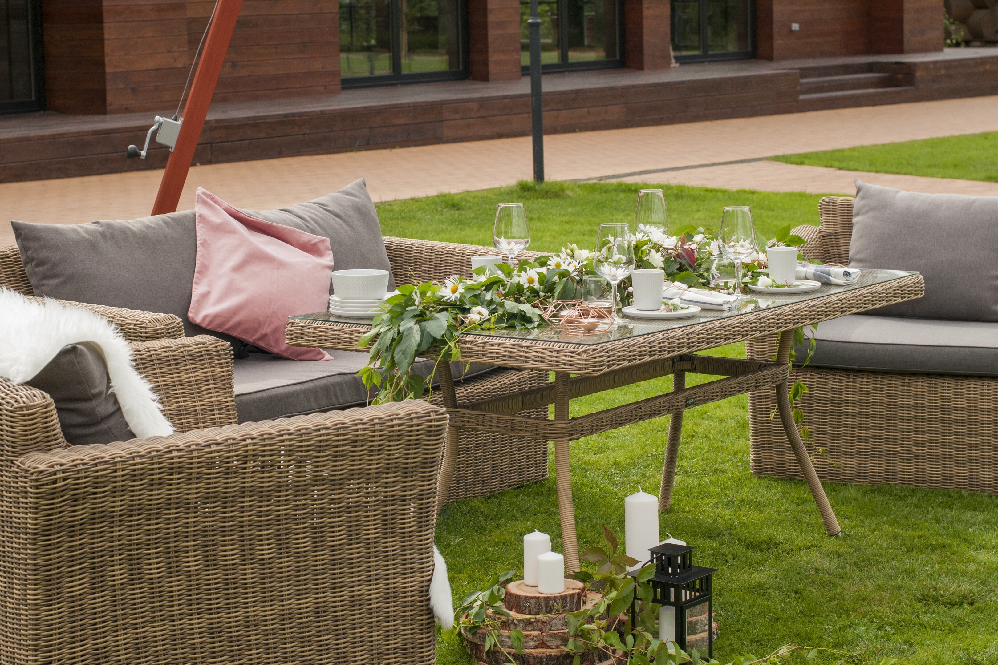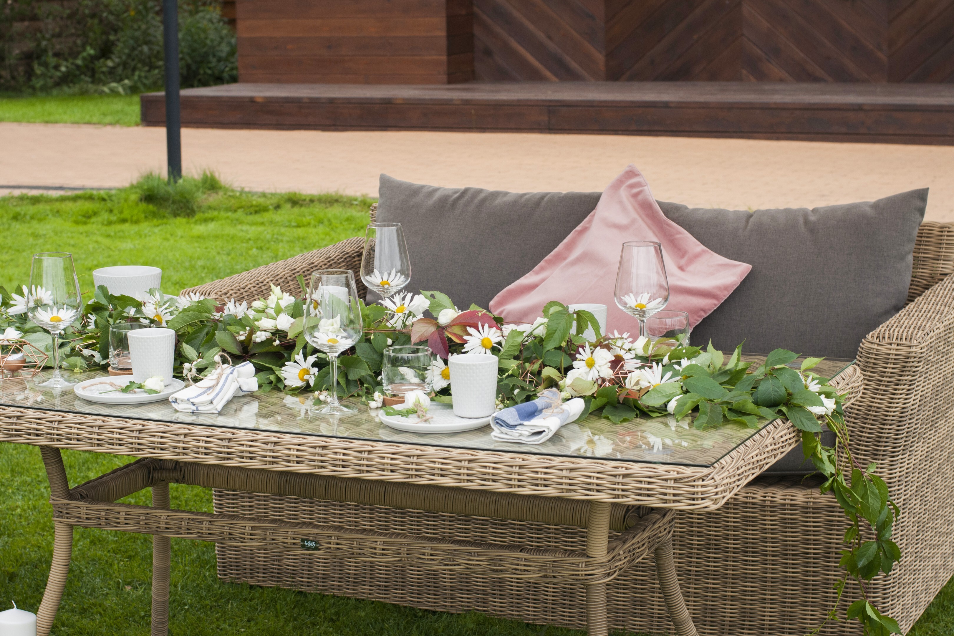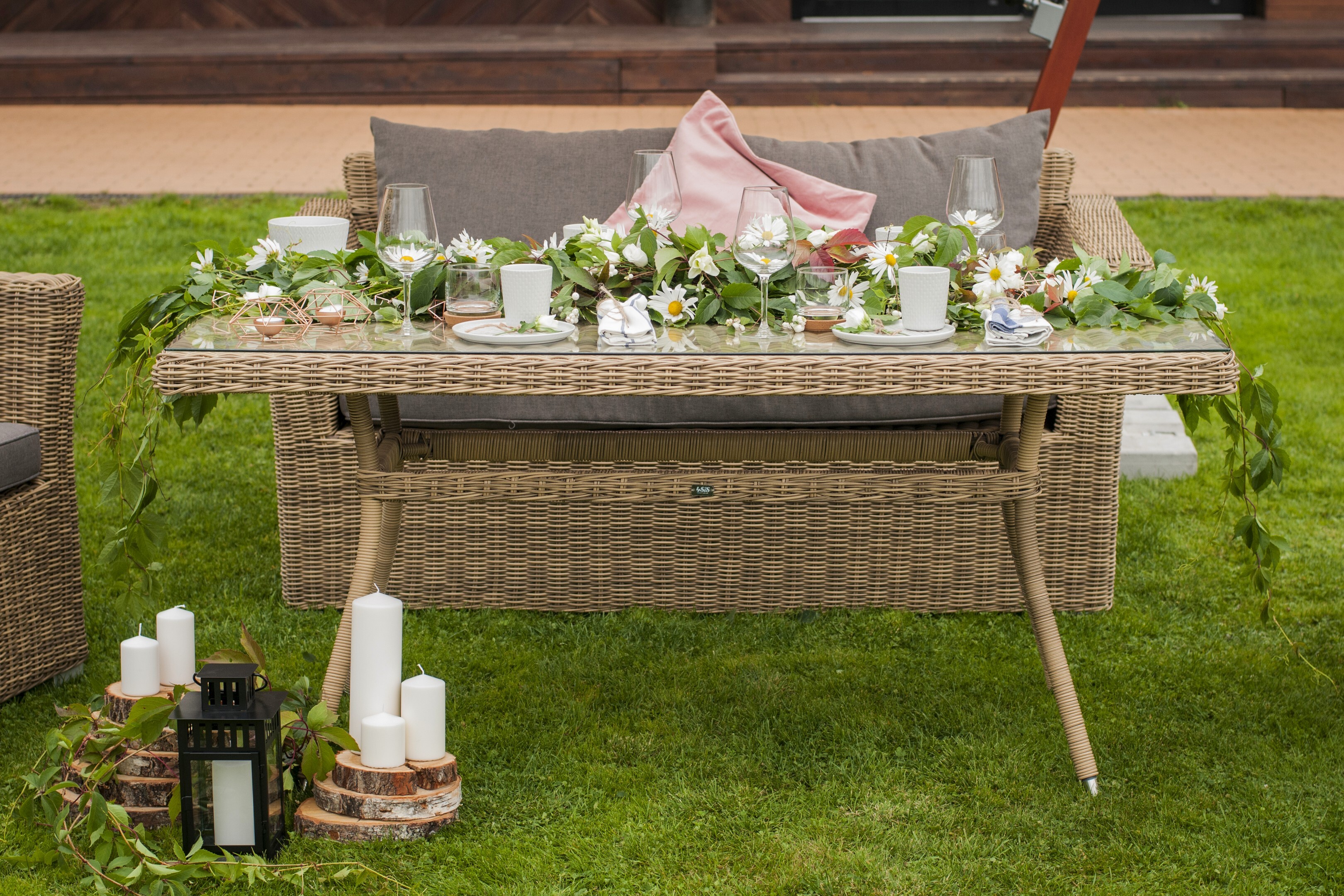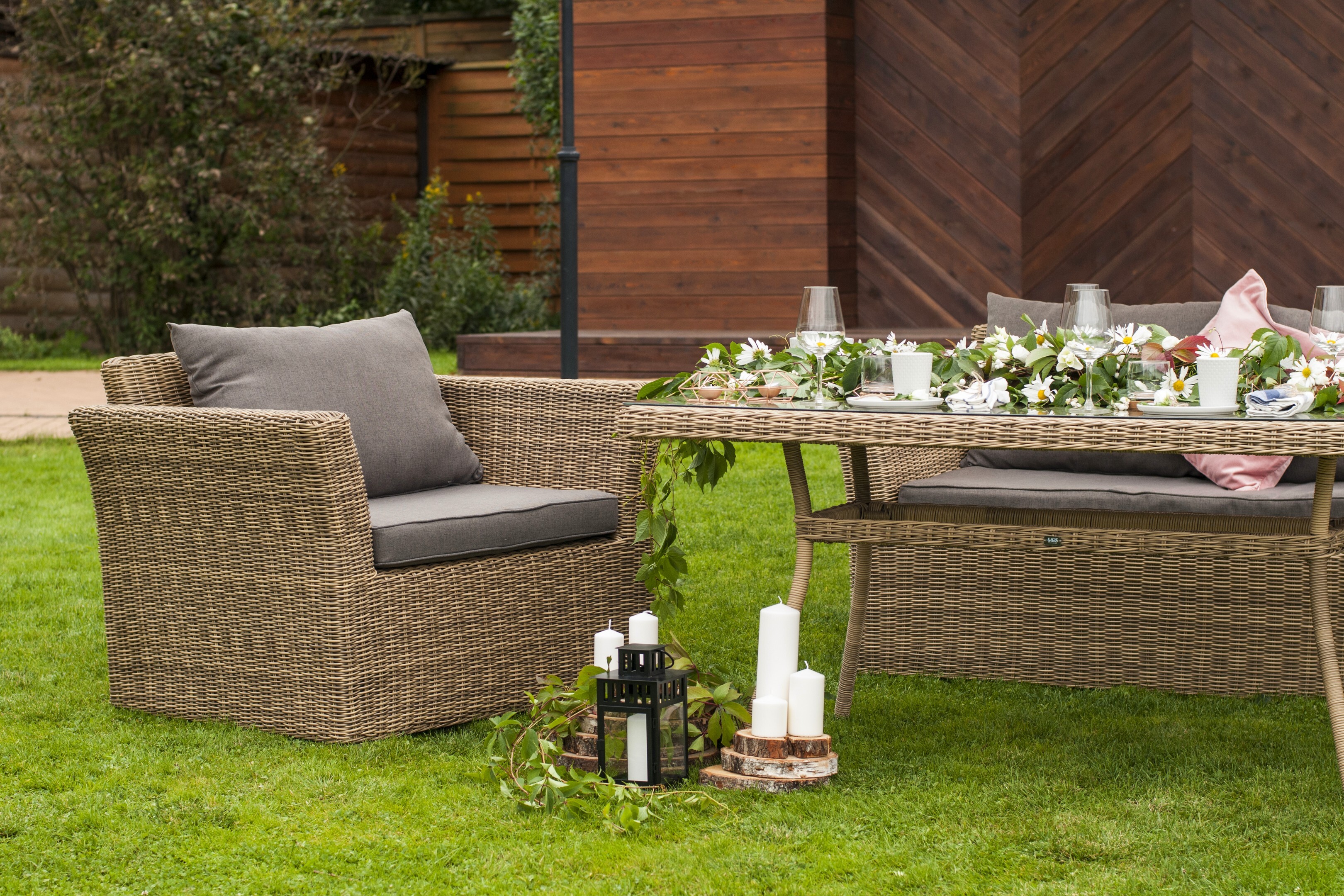 Плетеная садовая обеденная группа «Аффогато» на 4 персоны. Комплект состоит из: - большого обеденного стола «Латте» со стеклянной столешницей - 1600×900×750 мм. - двухместного дивана «Капучино» - 1700×865×815 мм. - двух кресел «Капучино» - 1040×865×815 мм. Мебель изготовлена из легкого, но прочного алюминия, оплетенного долговечным искусственным ротангом природного соломенного оттенка. На диване и креслах предусмотрены подушки с чехлами из полиэстера серого цвета. Съёмные чехлы пропитаны специальными влагоотталкивающими средствами, которые способы защитить от намокания. Данную обеденную группу можно также заказать в шоколадном оттенке. "Капучино" диван из искусственного ротанга двухместный, цвет соломенный 1шт. 1 700Х865Х815, "Капучино" кресло из искусственного ротанга, цвет соломенный 2шт. 1 040Х865Х815, "Латте" плетеный стол из искусственного ротанга 160х90см, цвет соломенный 1шт. 1 600Х900Х750,Бренд | 4SIS |