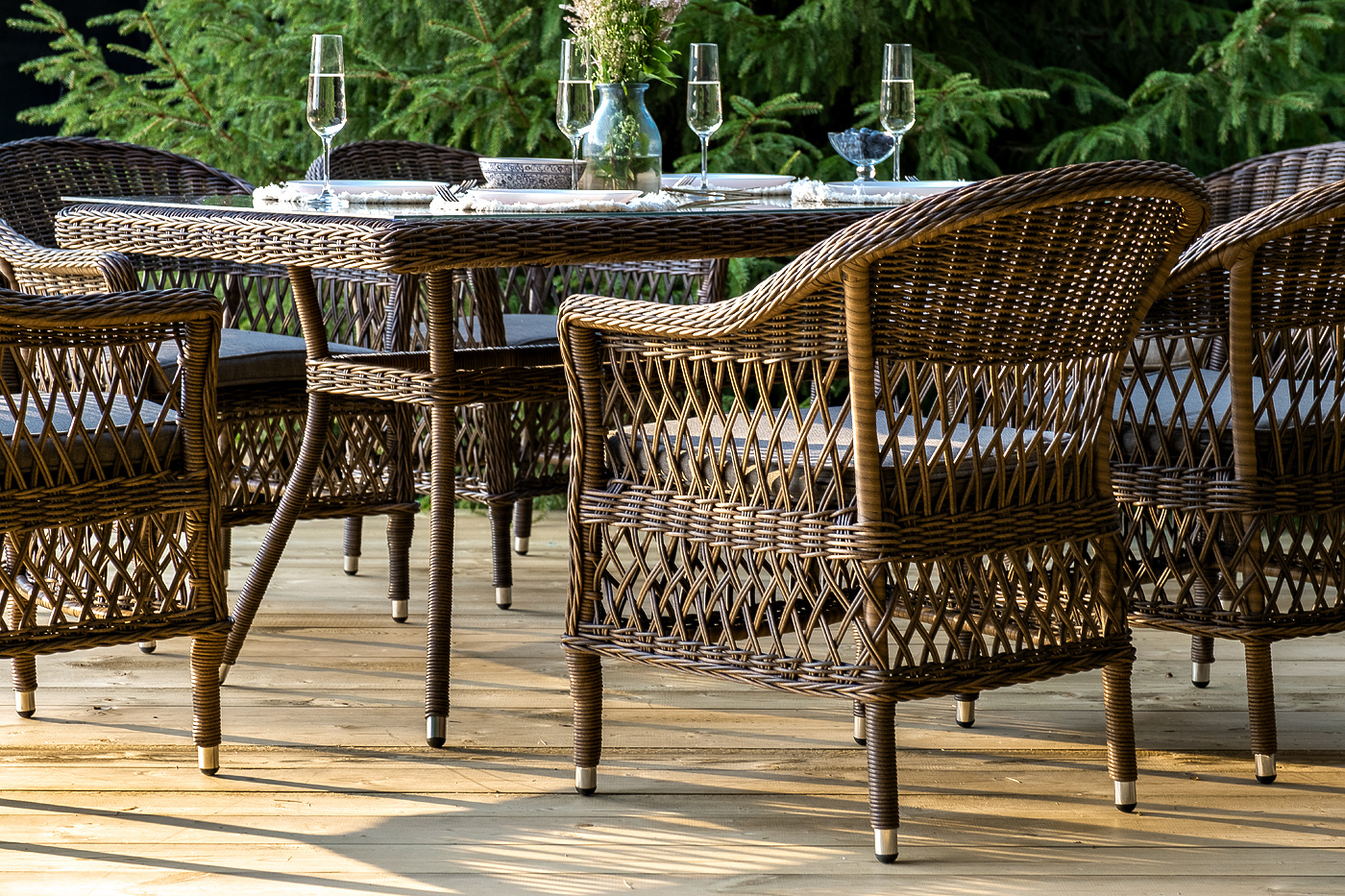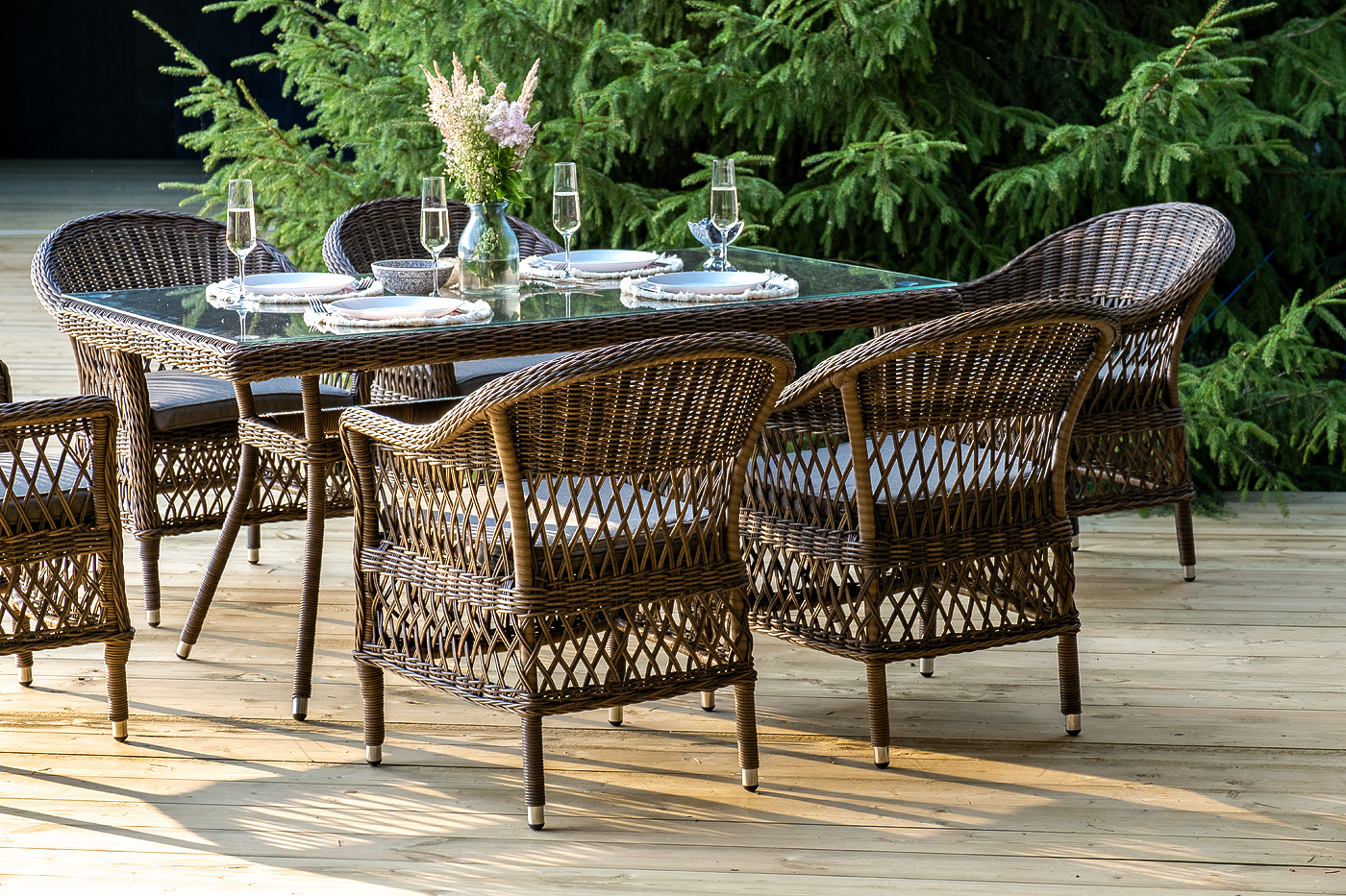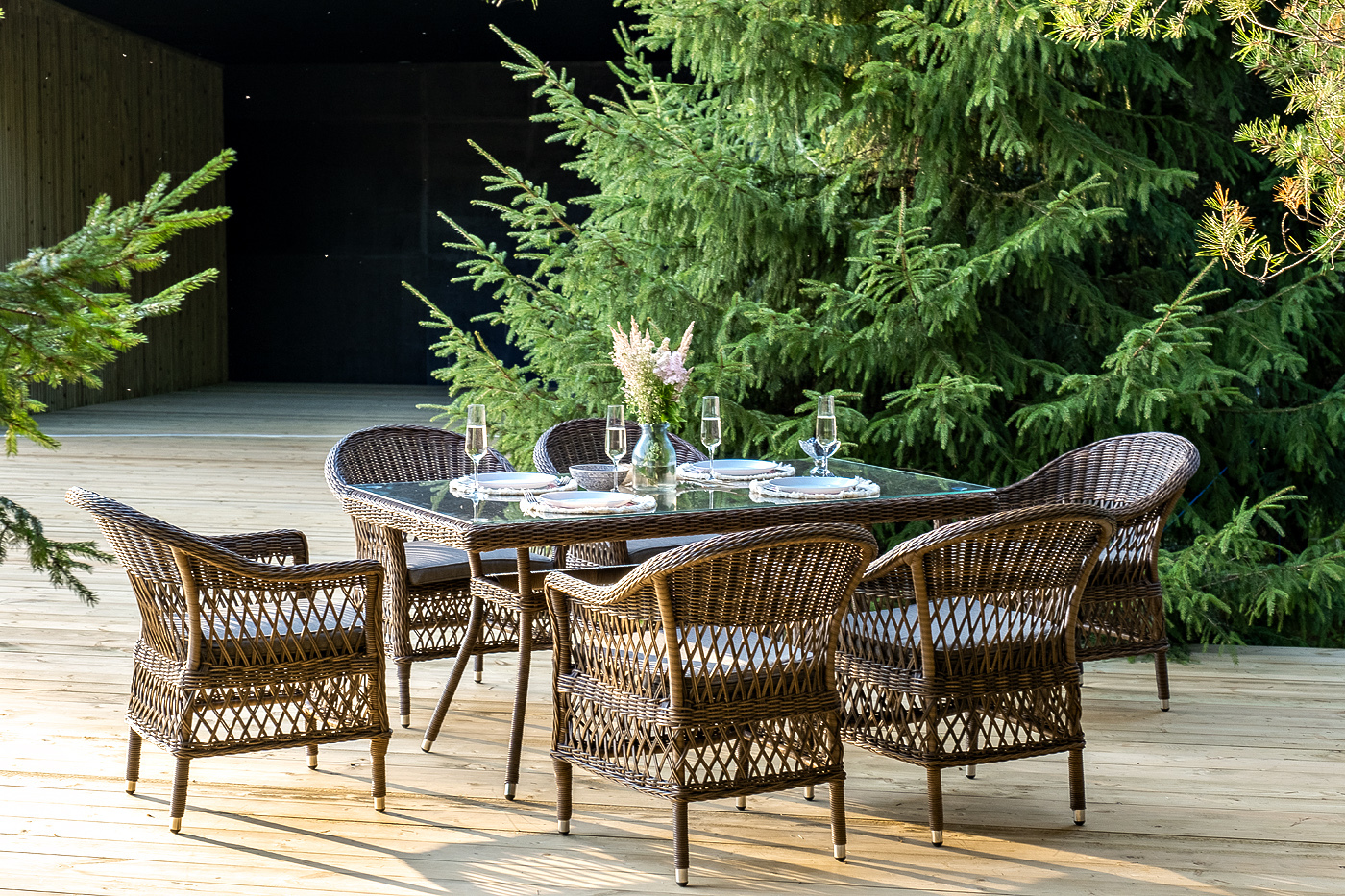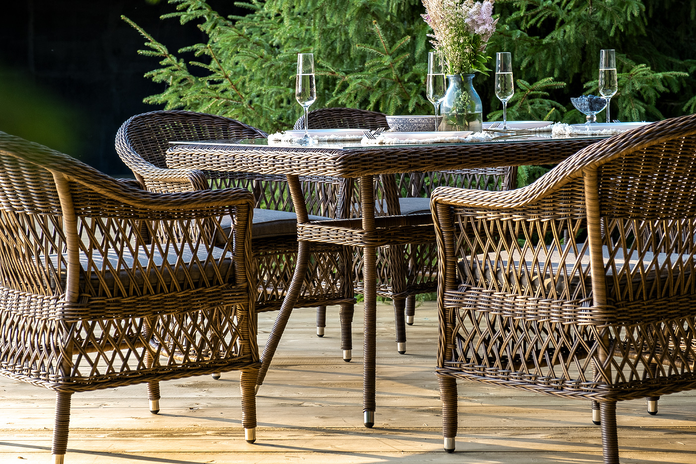 Обеденная группа «Амароне» относится к числу садовой мебели для обустройства открытых террас и веранд. В комплект входят: - обеденный стол «Латте» – 1600×900×750 мм. - шесть стульев «Сицилия», размер каждого – 590×640×820 мм. Алюминий используется при создании прочного каркаса мебели. Оформлен ручным плетением из круглого искусственного ротанга коричневого цвета. На креслах расположились мягкие подушки серого оттенка. Их чехлы изготовлены из полиэстера, плотность которого 300гр/м2. Ткань проходит обработку влагоотталкивающими составами. В качестве рабочей поверхности плетеного обеденного стола выступает стеклянная столешница, которая крепится при помощи вакуумных силиконовых держателей и поставляется в собранном виде. "Сицилия" плетеный стул из искусственного ротанга, цвет коричневый 6шт. 590Х640Х820, "Латте" плетеный стол из искусственного ротанга 160х90см, цвет коричневый 1шт. 1 600Х900Х750,Бренд | 4SIS |