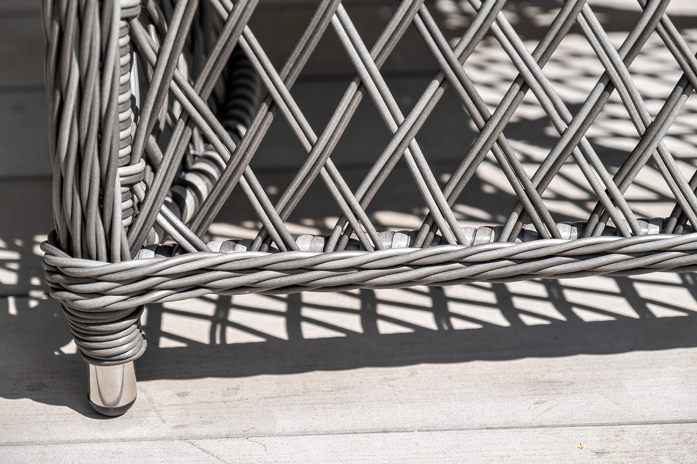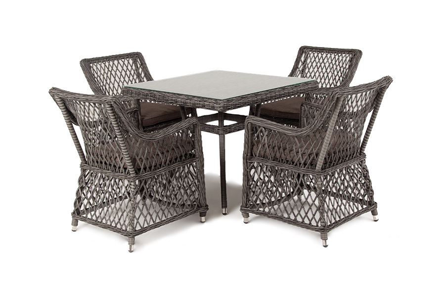 Комплет для обеденной зоны «Айриш» состоит из: - квадратного обеденного стола, размером - 900×900×750 мм. - 4 плетеных кресел - 550×660×850 мм. Каркас мебели выполнен из прочного и легкого алюминия, оплетенного вручную долговечным искусственным ротангом графитового цвета, столешница – закаленное стекло. На креслах предусмотрены подушки со съёмными влагоотталкивающими чехлами. Обеденная группа «Айриш» представлена также в соломенном, коричневом и бежевом цветах. Все изделия можно купить по отдельности. "Айриш" стол плетеный из искусственного ротанга, цвет графит 1шт. 900Х900Х750, "Латте" плетеное кресло из искусственного ротанга, цвет графит 4шт. 550Х660Х850,Бренд | 4SIS |