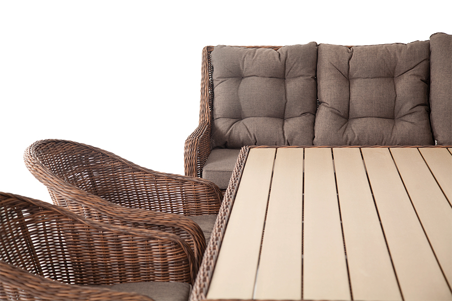 Угловая модульная лаунж-зона с обеденным столом и тремя стульями. В состав входят: - модульный диван (правый модуль - 1150×900×990 мм, левый модуль - 1150×900×990 мм, угловой модуль - 1630×900×990 мм, центральный модуль - 570×900×990 мм). - плетеный обеденный стол (1800×1000×680 мм). - кресло 3 шт. - (570×680×810 мм). Столешница выполнена из современного полимерного материала ДПК бежевого оттенка. Каркас изготовлен из прочного и легкого металла – алюминия, вручную оплетенного искусственной ротанговой лозой насыщенного шоколадного оттенка. Модульный диван и кресла изготовлены посредством ручного плетения из искусственного ротанга коричневого цвета. Для укрепления конструкции использован алюминиевый каркас. В комплекте - подушки со съёмными чехлами. Они обработаны влагоотталкивающей пропиткой, не пропускают случайно пролитую жидкось. "Бергамо" плетеный угловой диванный модуль, цвет коричневый 1шт. 1 630Х900Х990, "Бергамо" плетеный левый модуль дивана, цвет коричневый 1шт. 1 150Х900Х990, "Бергамо" плетеный правый модуль дивана, цвет коричневый 1шт. 1 150Х900Х990, "Бергамо" плетеный центральный модуль дивана, цвет коричневый 1шт. 570Х900Х990, "Бергамо" плетеный обеденный стол, цвет коричневый 1шт. 1 800Х1 000Х680, "Равенна" плетеное кресло из искусственного ротанга, цвет коричневый 3шт. 570Х680Х810,Бренд | 4SIS |