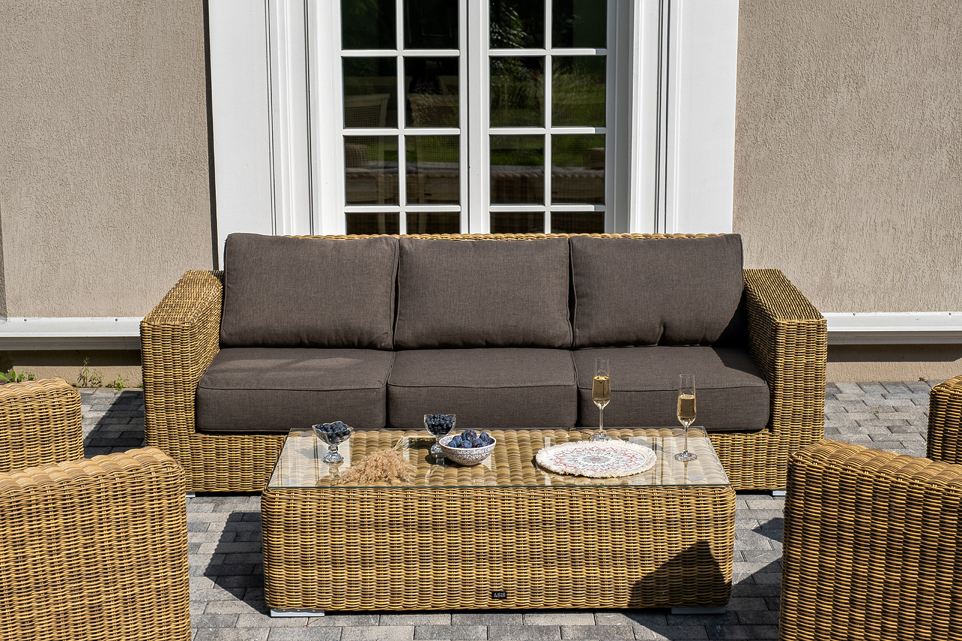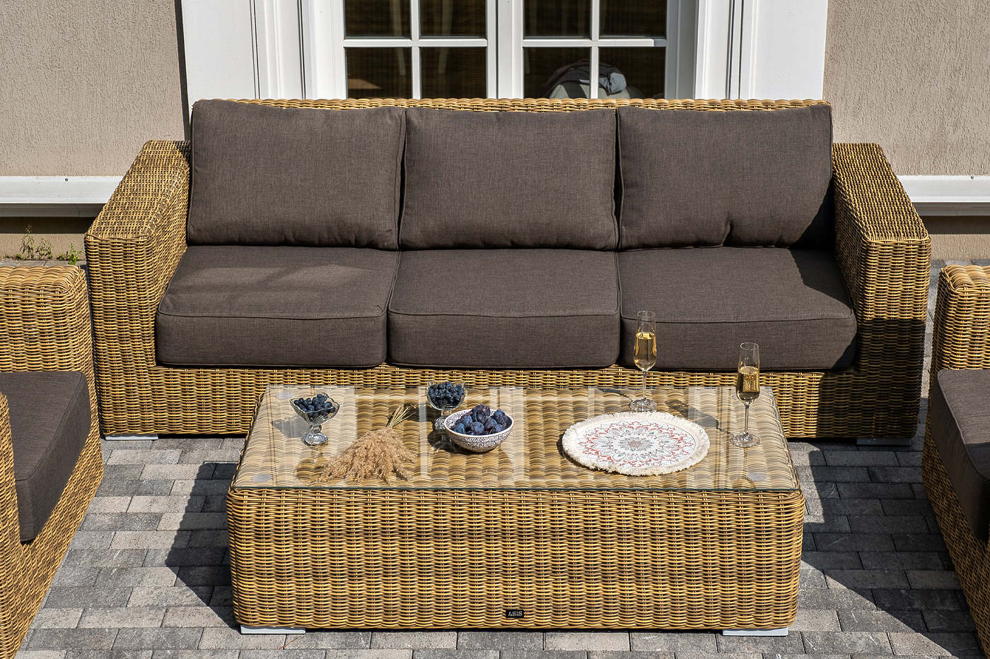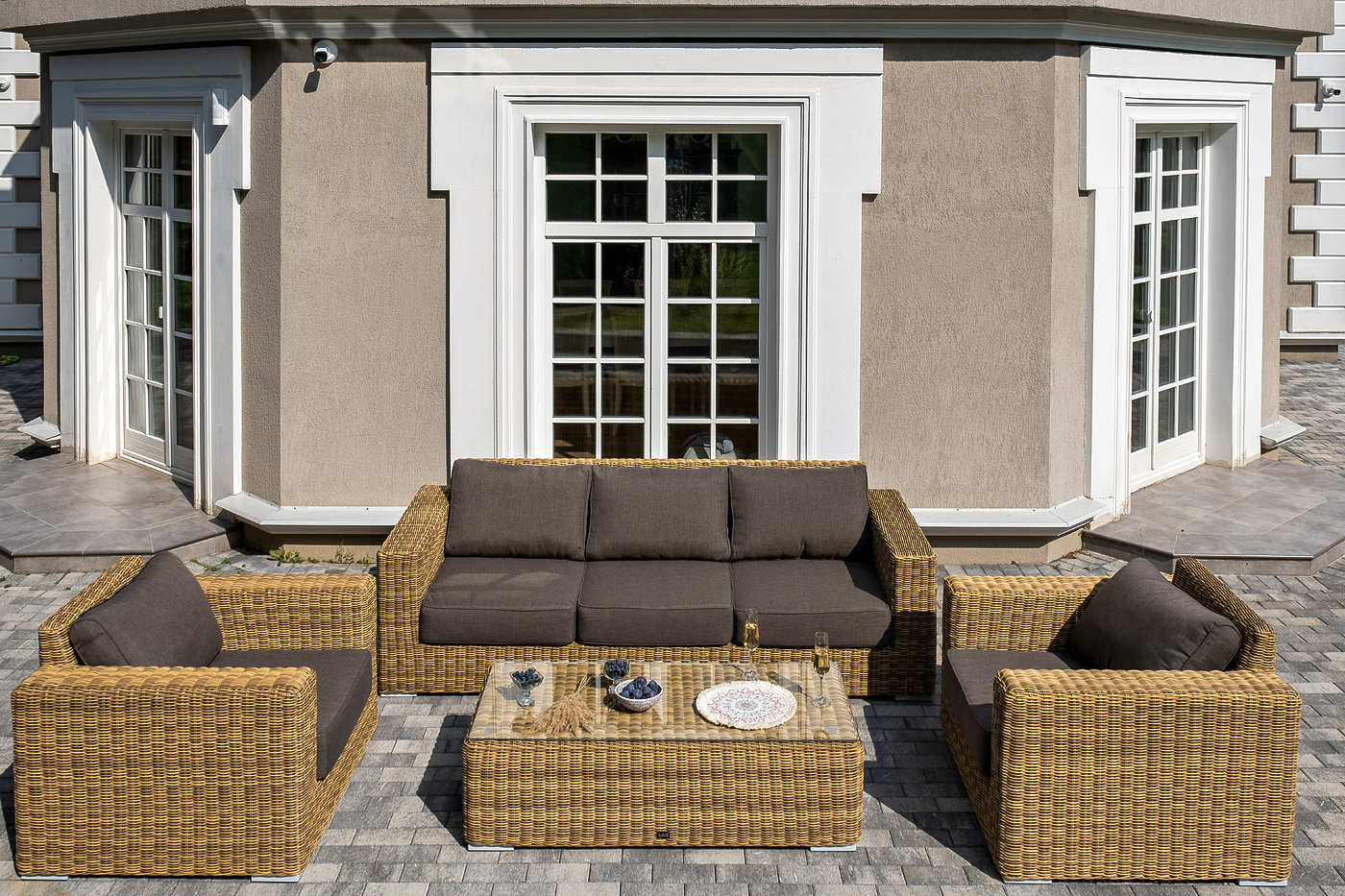 Комплект «Боно» с плетением из искусственного круглого ротанга для обустройства лаунж-зоны. В ее составе находятся: - трехместный диван – 2300×900×775 мм. - два кресла – 1000×900×775 мм. - журнальный столик – 1300×600×400 мм. В качестве основы применяется прочный алюминиевый каркас. Цвет комплекта – соломенный. На креслах и диване предусмотрены мягкие подушки, съёмные чехлы которых пошиты из полиэстера, плотностью 300гр/м2. Ткань в обязательном порядке пропитывается влагоотталкивающими составами. Поверхность плетеного столика представляет столешница из закаленного стекла – 5 мм. "Боно" диван из искусственного ротанга трехместный, цвет соломенный 1шт. 2 300Х900Х775, "Боно" журнальный столик из искусственного ротанга, цвет соломенный 1шт. 1 300Х600Х400, "Боно" кресло из искусственного ротанга, цвет соломенный 2шт. 1 000Х900Х775,Бренд | 4SIS |