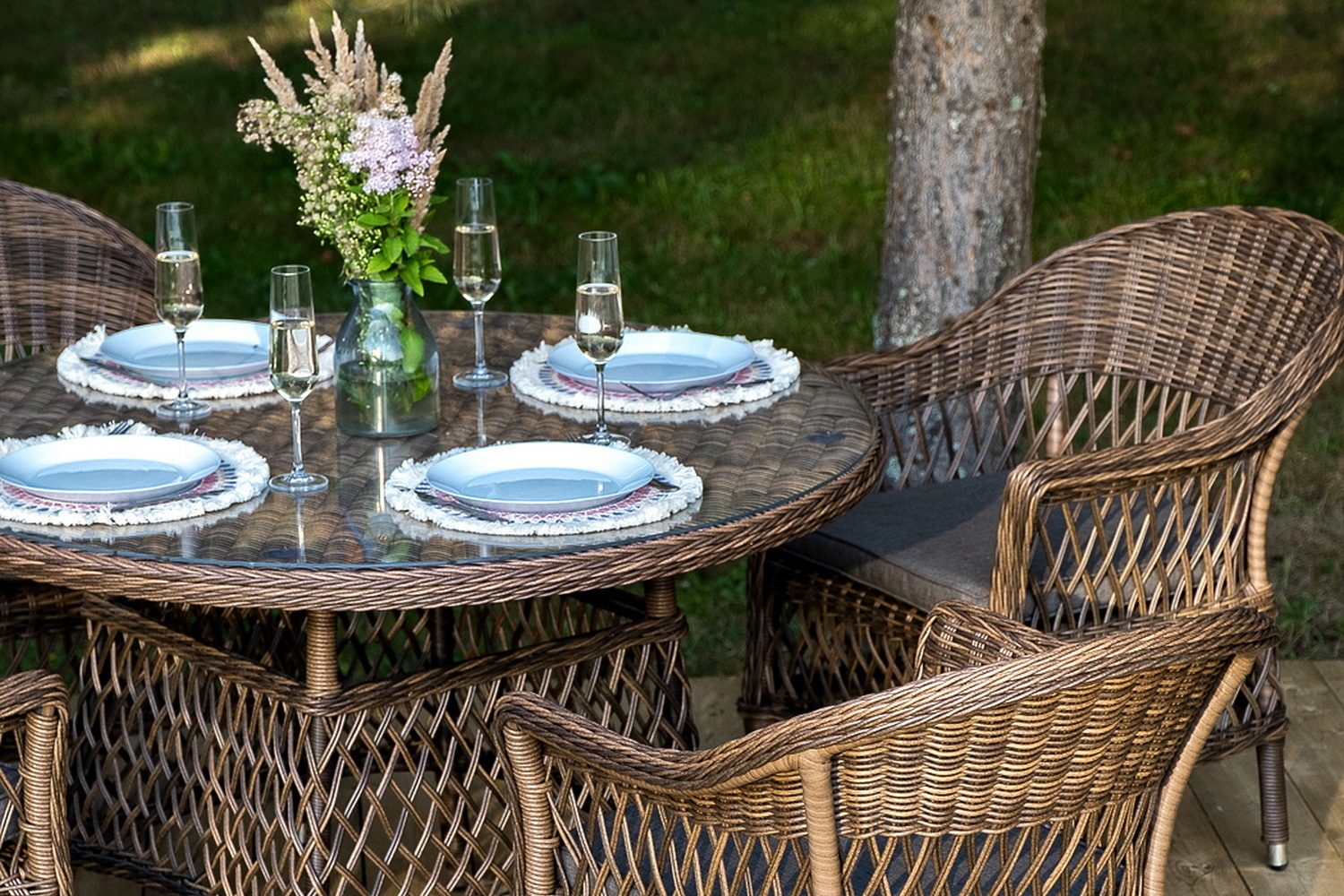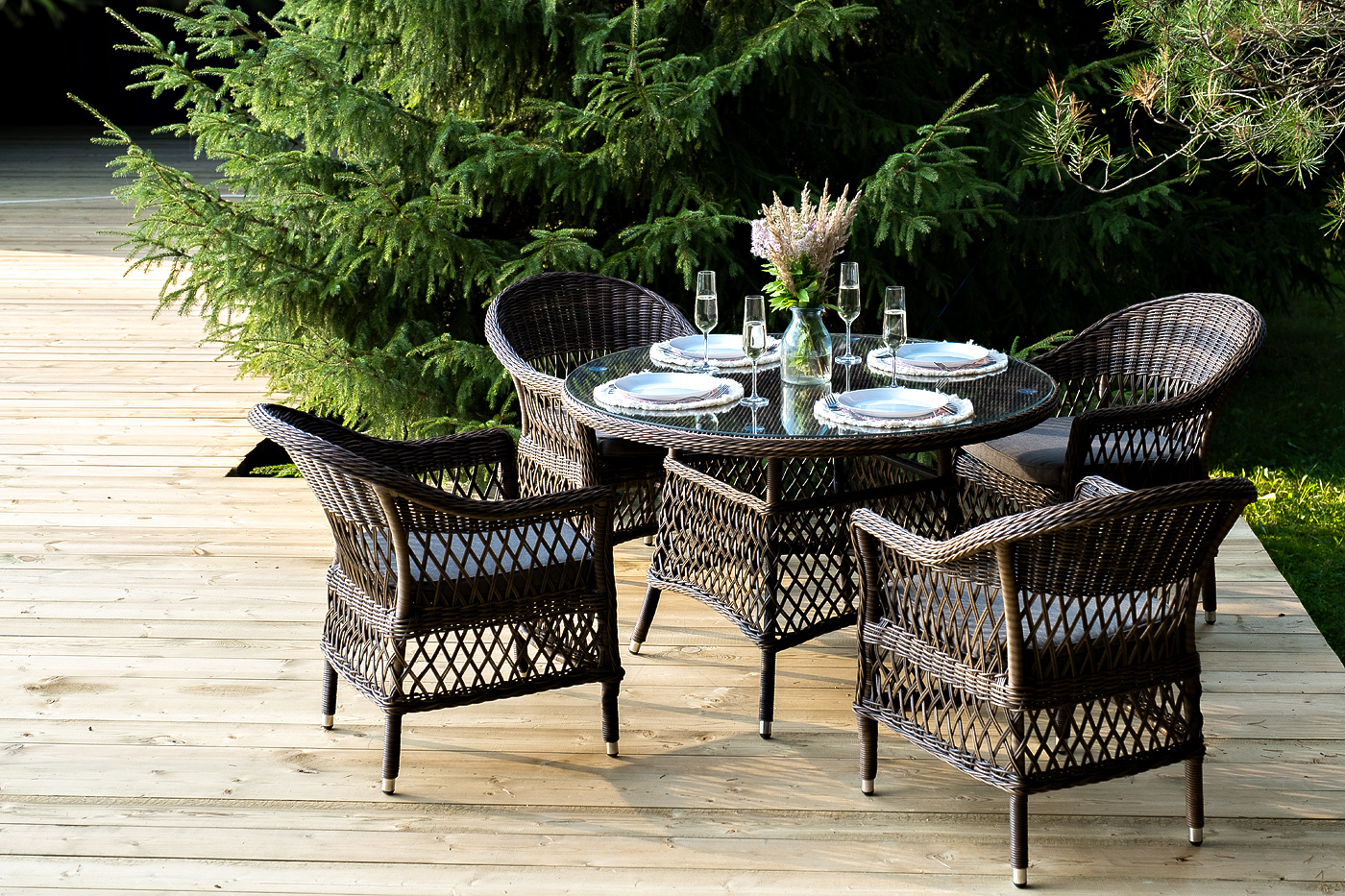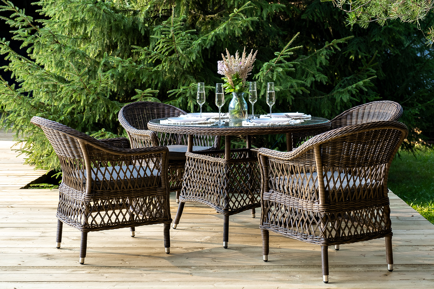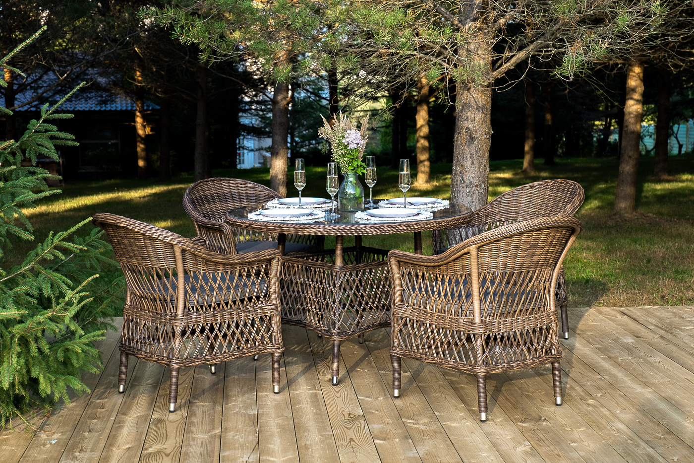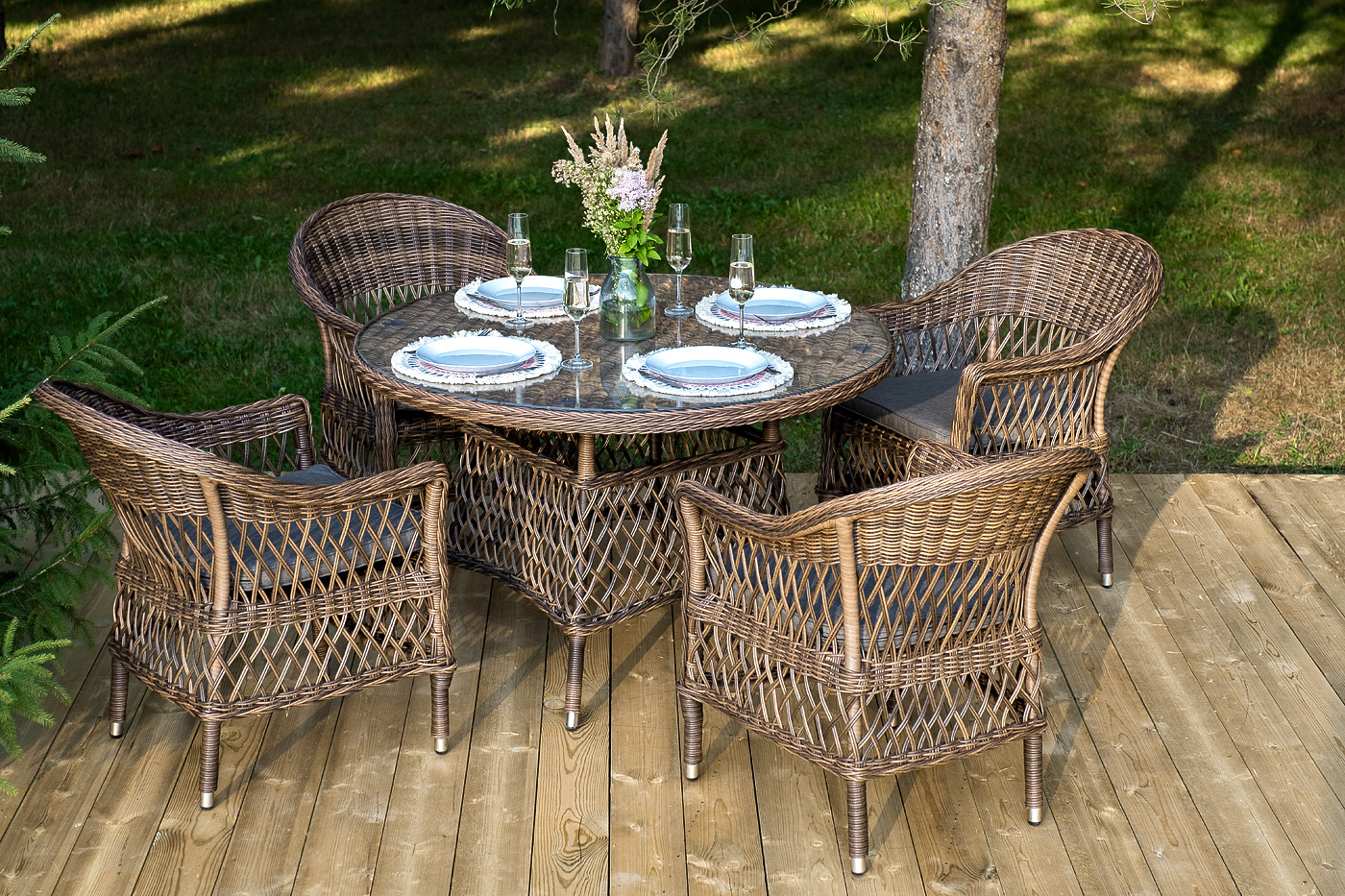 Обеденная группа «Дольче» дает возможность обустроить обеденную зону на открытом дачном участке, веранде или беседке. Она включает в себя: - стол «Эспрессо», размером – 1180×1180×750 мм. - четыре стула «Силиция», размер одного стула – 590×640×820 мм. Из алюминия выполнен устойчивый каркас мебели, который задекорирован искусственным ротангом круглого ручного плетения. Комплект представлен в коричневом цвете. Стулья укомплектованы мягкими подушками. Их защищают съёмные чехлы из полиэстера, цвет – серый. Материал имеет плотность 300гр/м2 и проходит обработку влагоотталкивающими составами. Обеденный стол дополняет рабочая поверхность, сделанная из прочного стекла. "Эспрессо" плетеный круглый стол, диаметр 118 см, цвет коричневый 1шт. 1 180Х1 180Х750, "Сицилия" плетеный стул из искусственного ротанга, цвет коричневый 4шт. 590Х640Х820,Бренд | 4SIS |