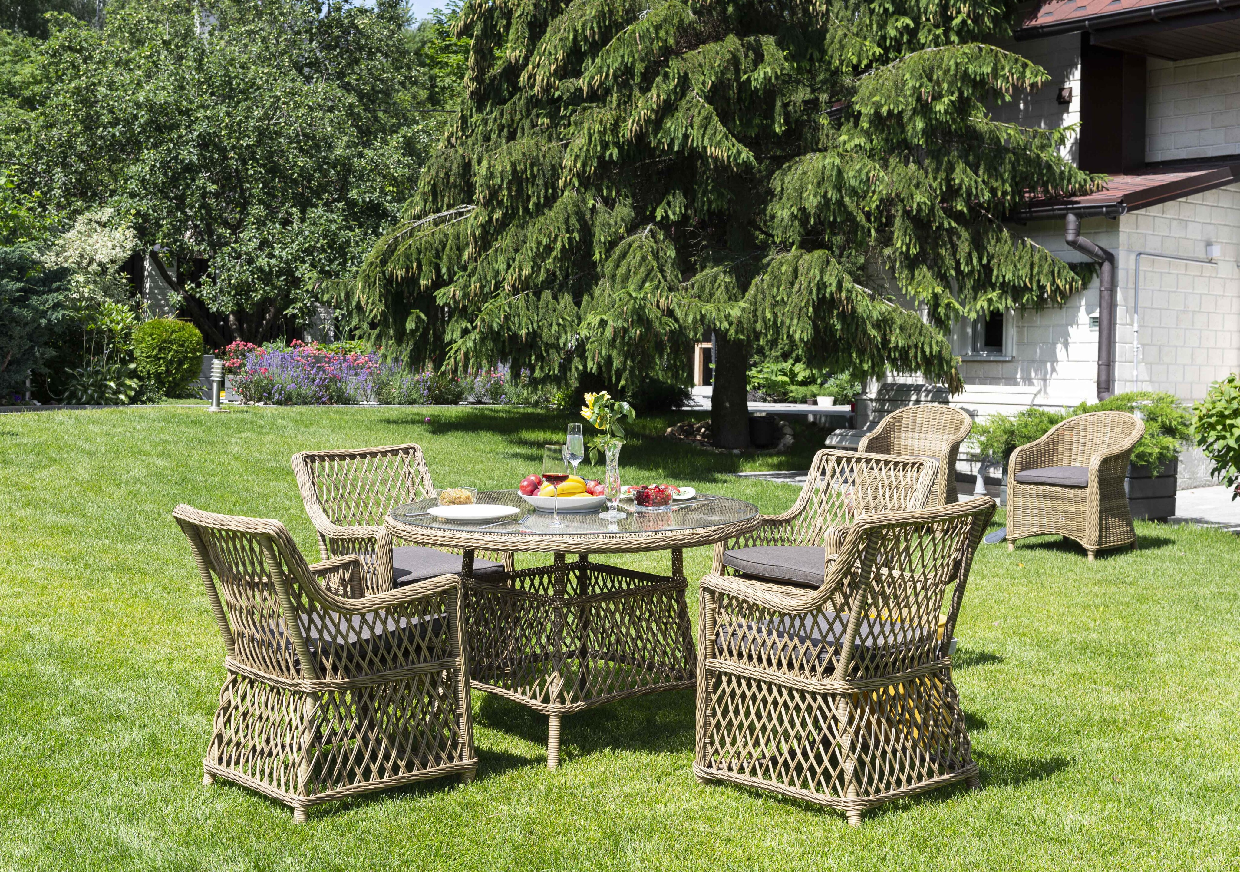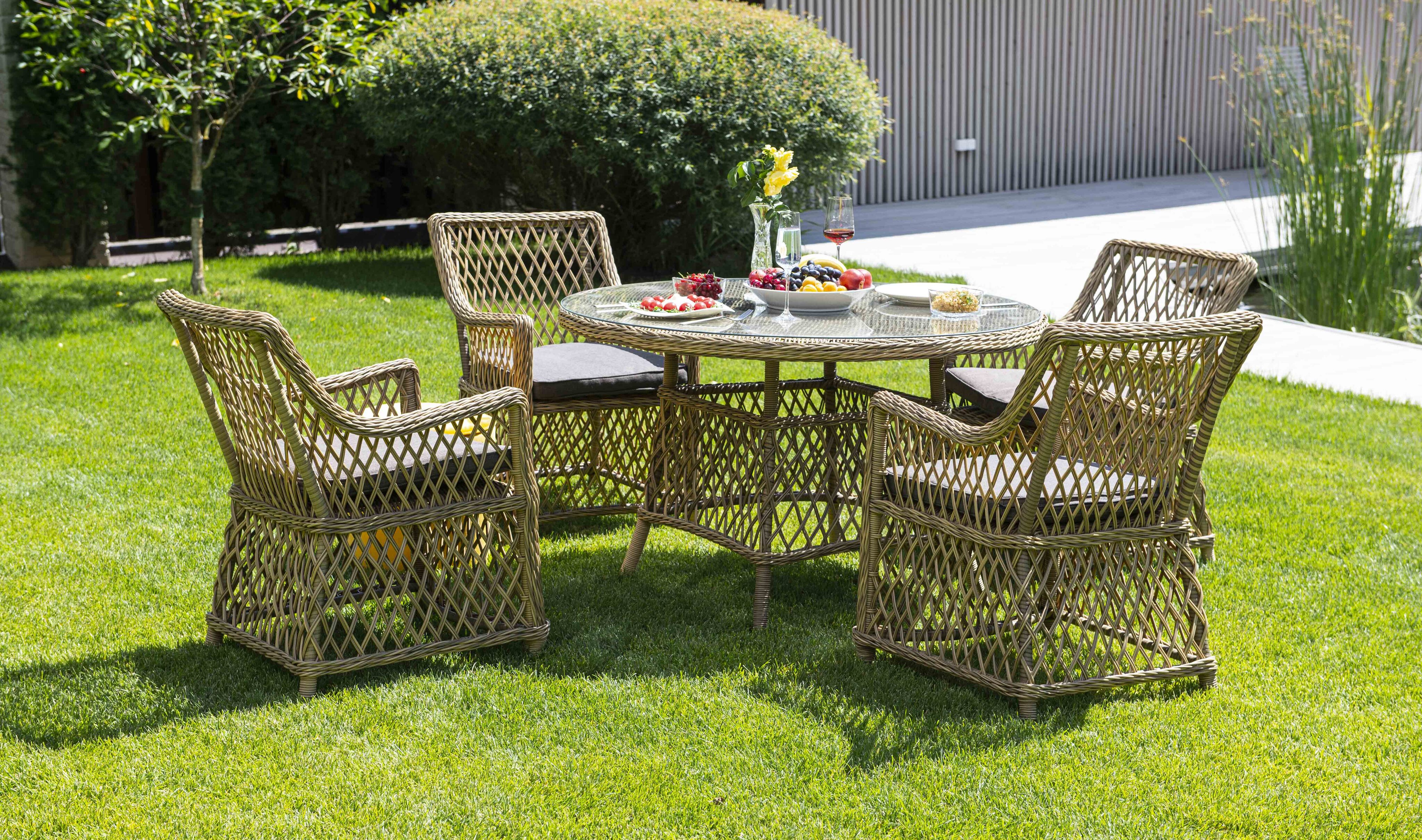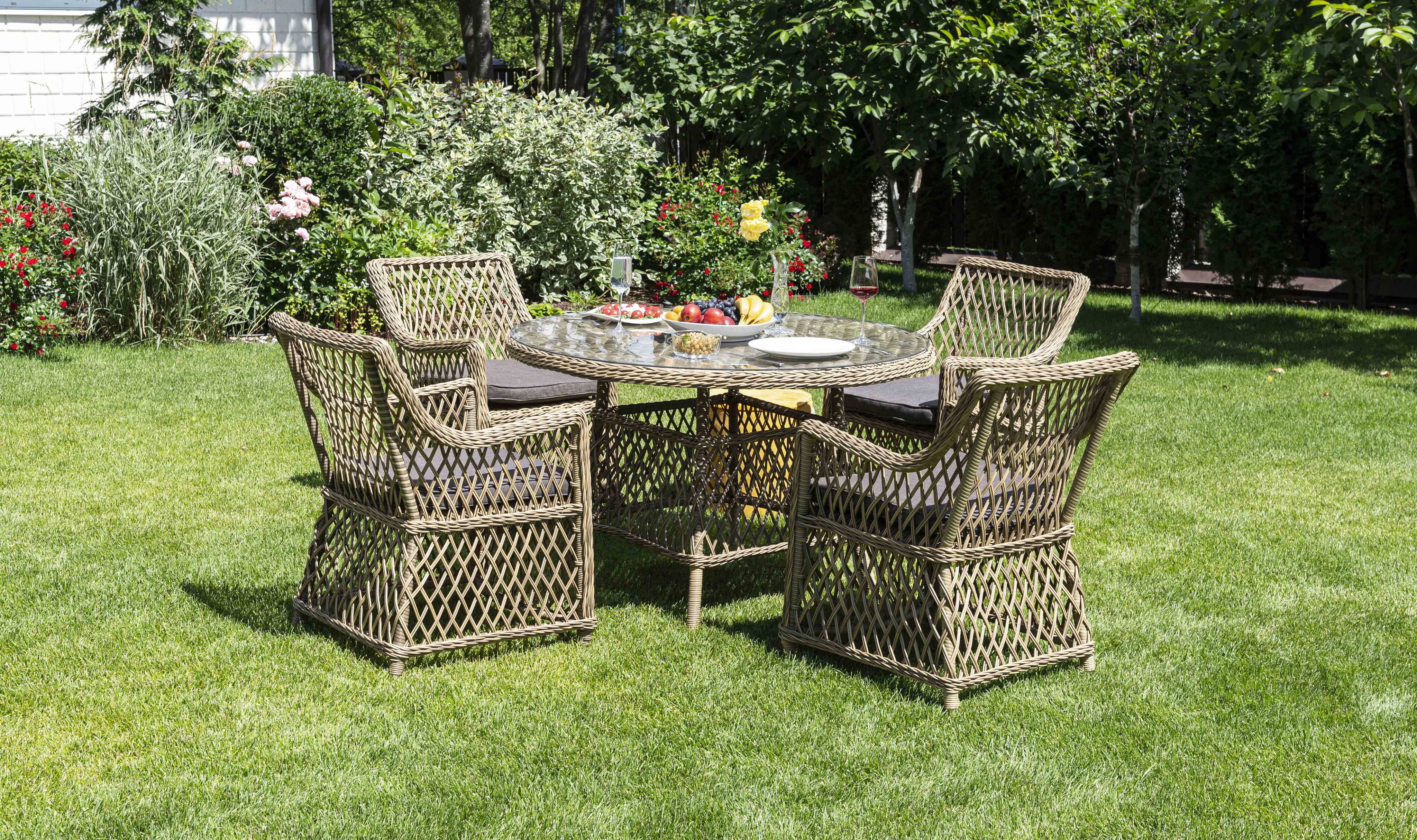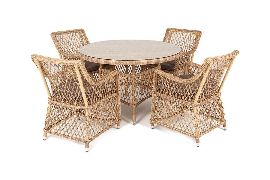 Классическая уличная обеденная группа «Доппио» для сада, летней веранды ресторана. В комплекте круглый обеденный стол «Эспрессо» (1180×1180×750 мм) с ударопрочной стеклянной столешницей и 4 кресла коллекции «Латте» 550×660×850 мм. Каркас мебели выполнен из прочного и легкого алюминия, вручную оплетенного круглым синтетическим ротангом натурального соломенного оттенка. На креслах предусмотрены мягкие подушки со съёмными чехлами серого цвета. Вы также можете приобрести каждый из элементов по отдельности для создания нужного вам количества посадочных мест и дизайна. "Эспрессо" плетеный круглый стол, диаметр 118 см, цвет соломенный 1шт. 1 180Х1 180Х750, "Латте" плетеное кресло из искусственного ротанга, цвет соломенный 4шт. 550Х660Х850,Бренд | 4SIS |