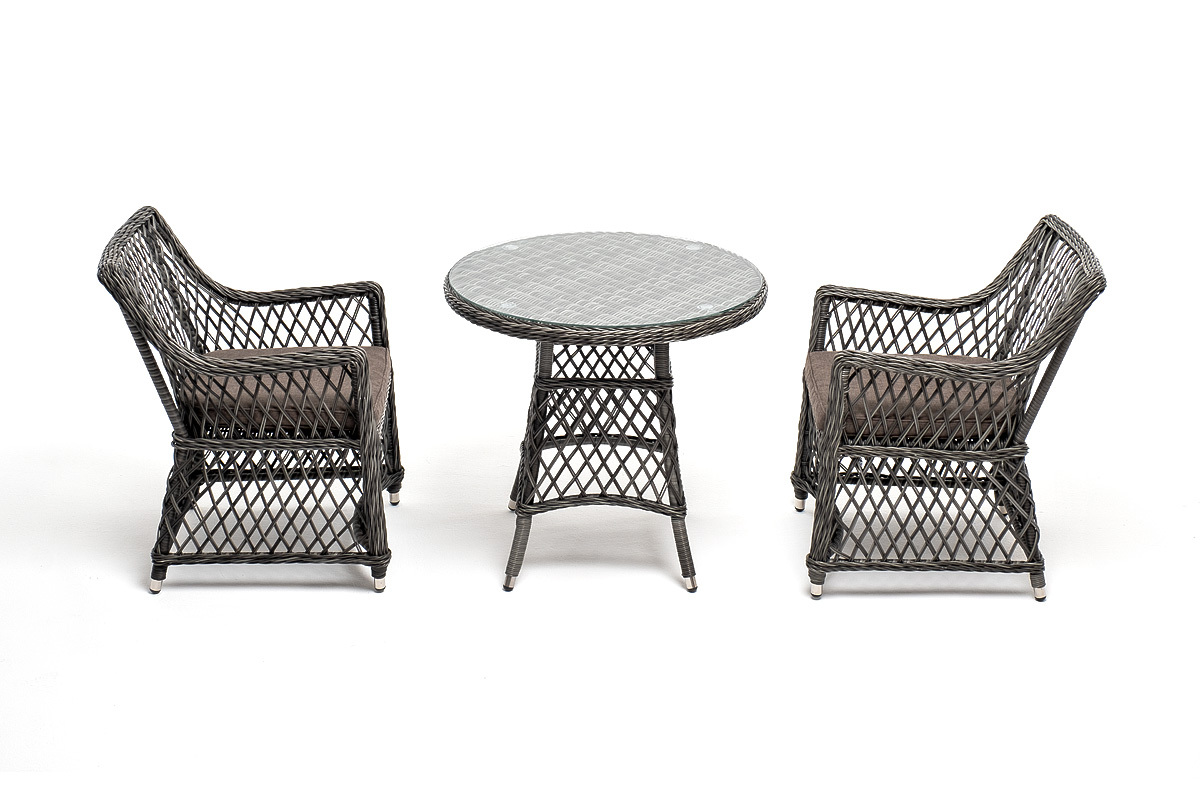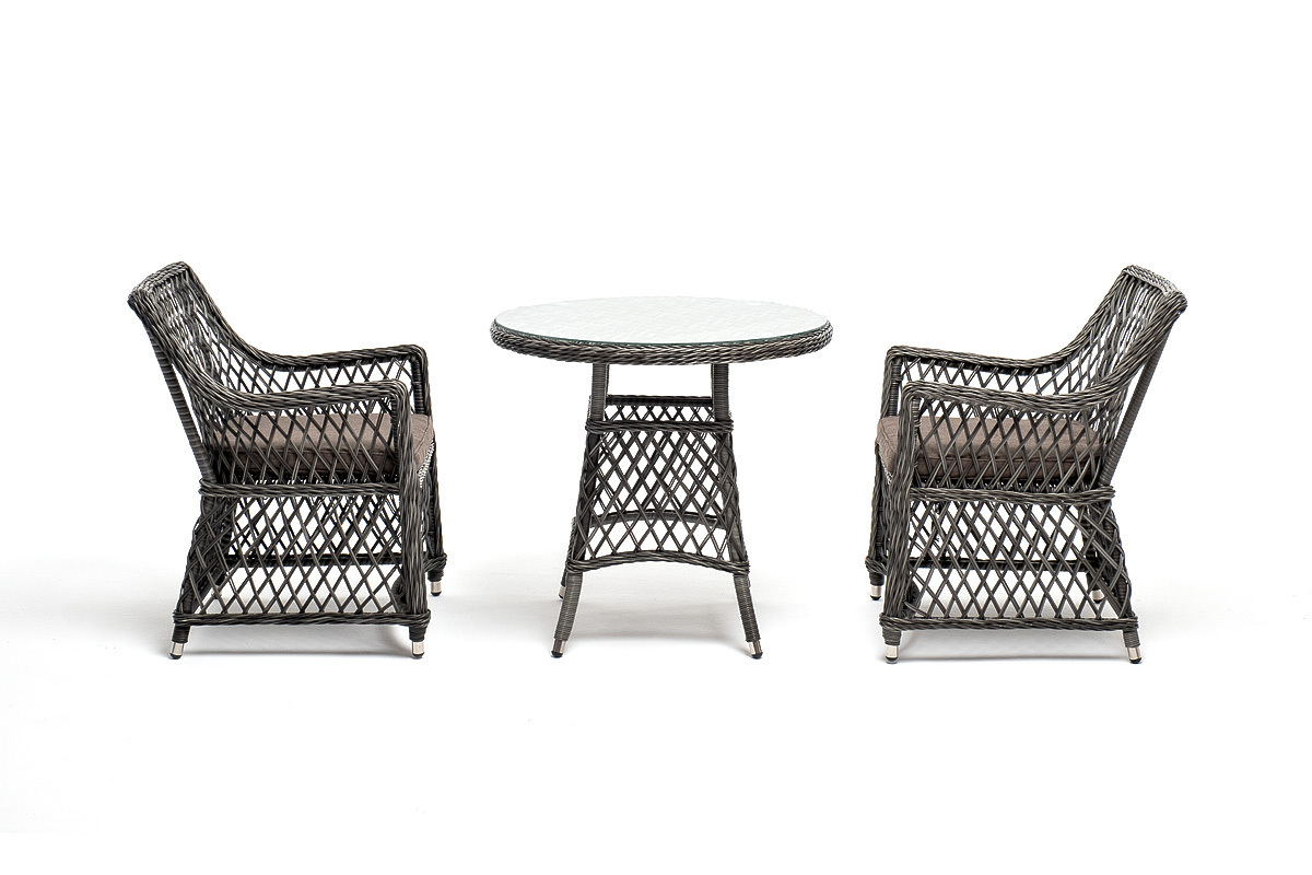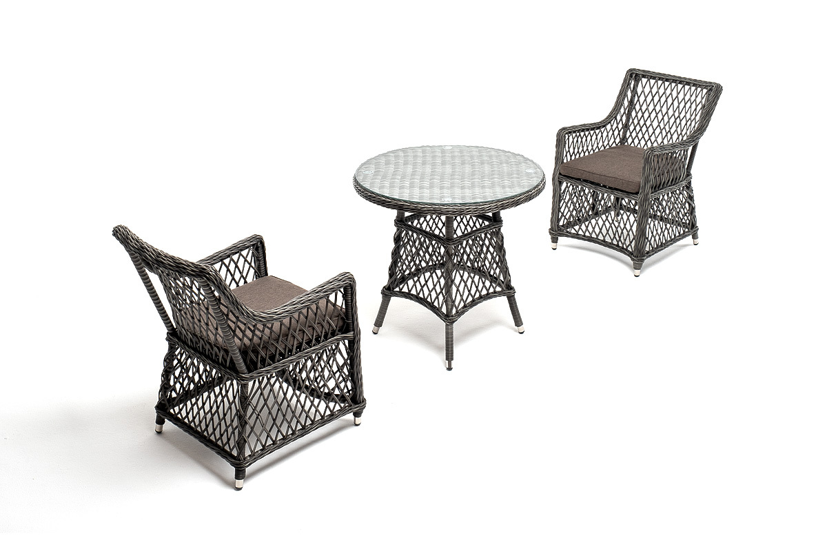 Комплект «Эспрессо–80 L» можно использовать в качестве обеденной группы на 2 персоны или как кофейный комплект на балконе или террасе. В плетеный комплект входит круглый стол «Эспрессо» диаметром 80 см с ударопрочной стеклянной столешницей и 2 кресла коллекции «Латте» 550×660×850 мм. Набор представлен в графитовом цвете. "Эспрессо" плетеный круглый стол, диаметр 80 см, цвет графит 1шт. 800Х800Х750, "Латте" плетеное кресло из искусственного ротанга, цвет графит 2шт. 550Х660Х850,Бренд | 4SIS |