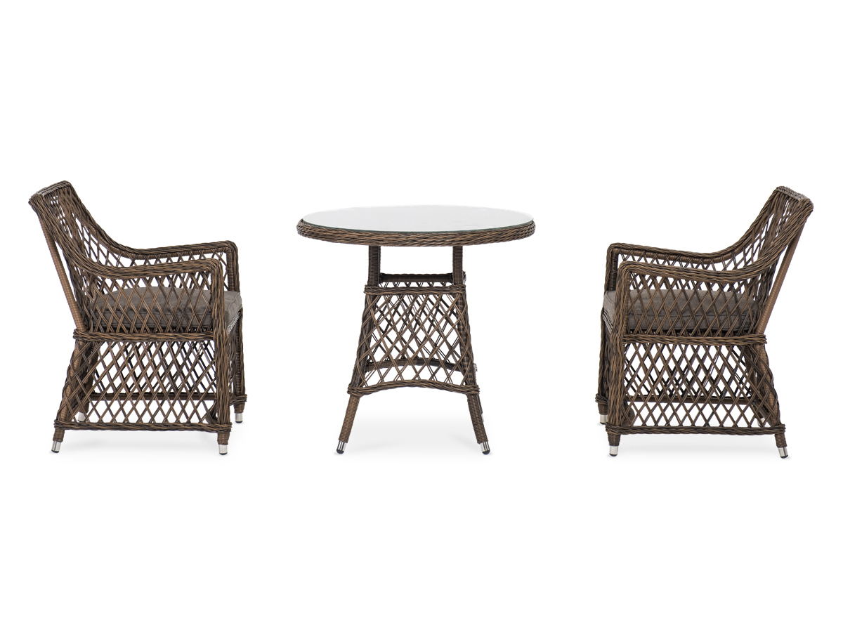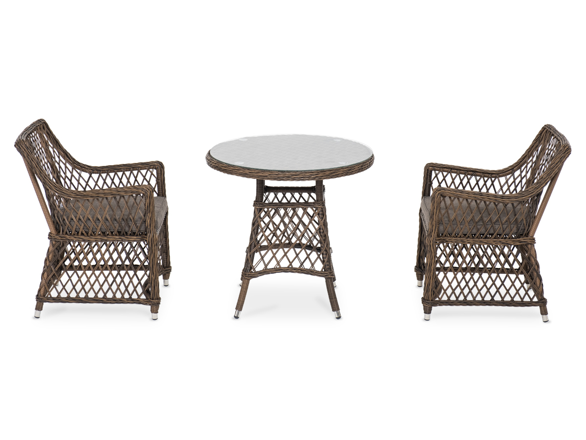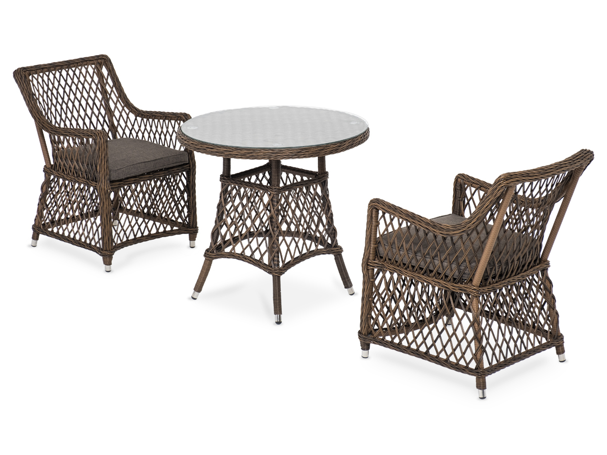 Комплект «Эспрессо–80 L» можно использовать в качестве обеденной группы на 2 персоны или как кофейный комплект на балконе или террасе. В плетеный комплект входит круглый стол «Эспрессо» диаметром 80 см с ударопрочной стеклянной столешницей и 2 кресла коллекции «Латте» 550×660×850 мм. Набор представлен в коричневом цвете. "Латте" плетеное кресло из искусственного ротанга, цвет коричневый 2шт. 550Х660Х850, "Эспрессо" плетеный круглый стол, диаметр 80 см, цвет коричневый 1шт. 800Х800Х750,Бренд | 4SIS |